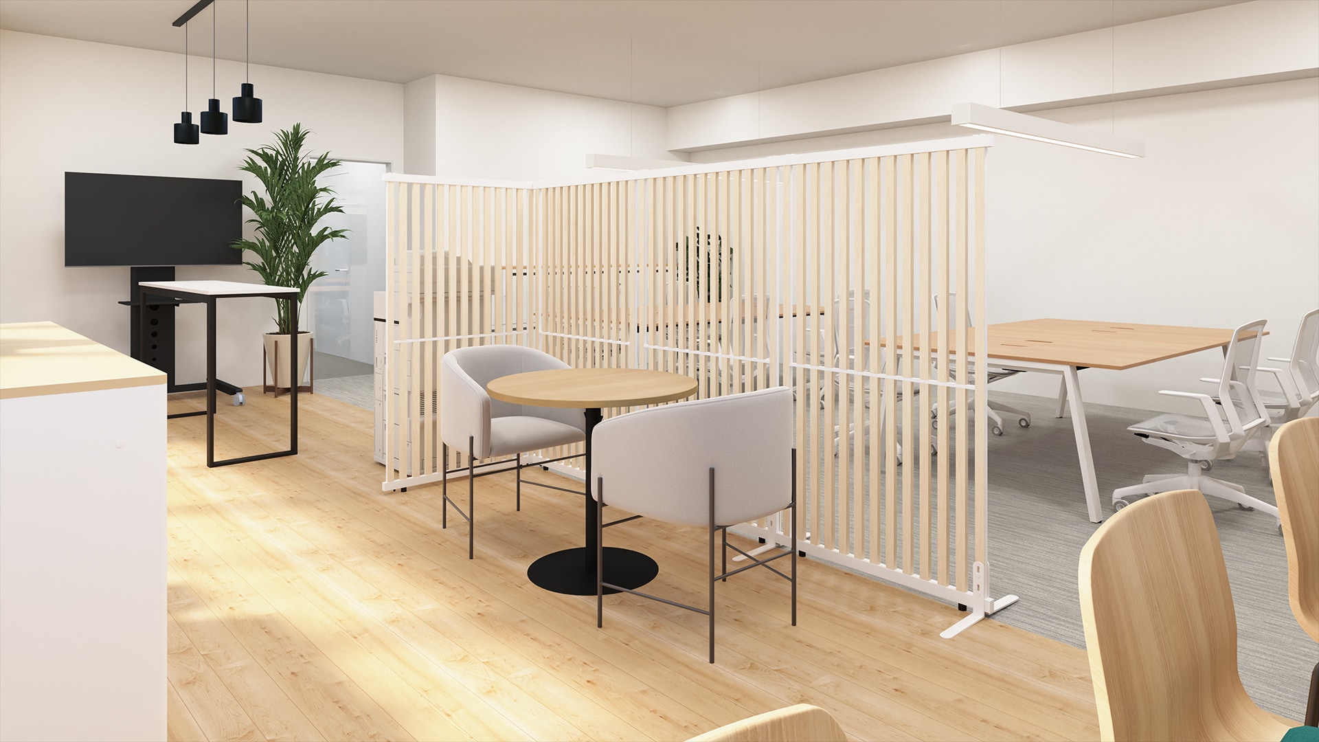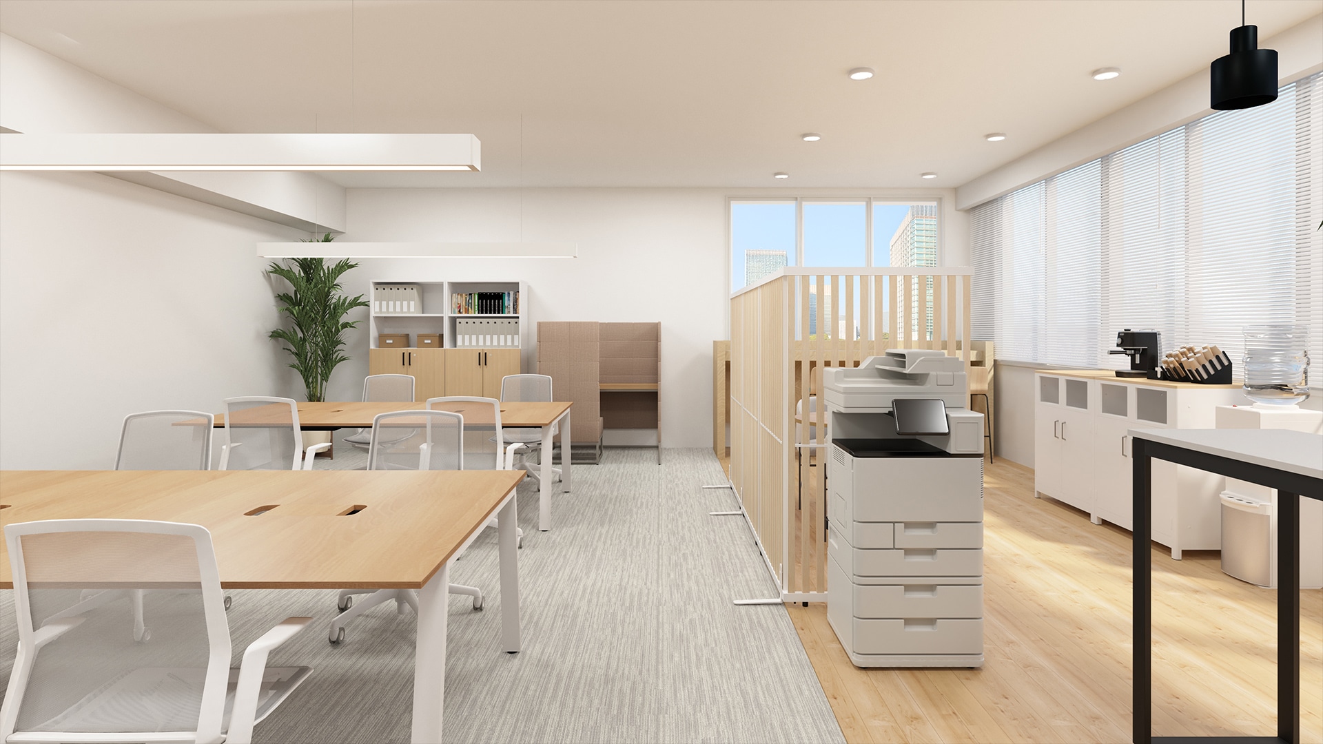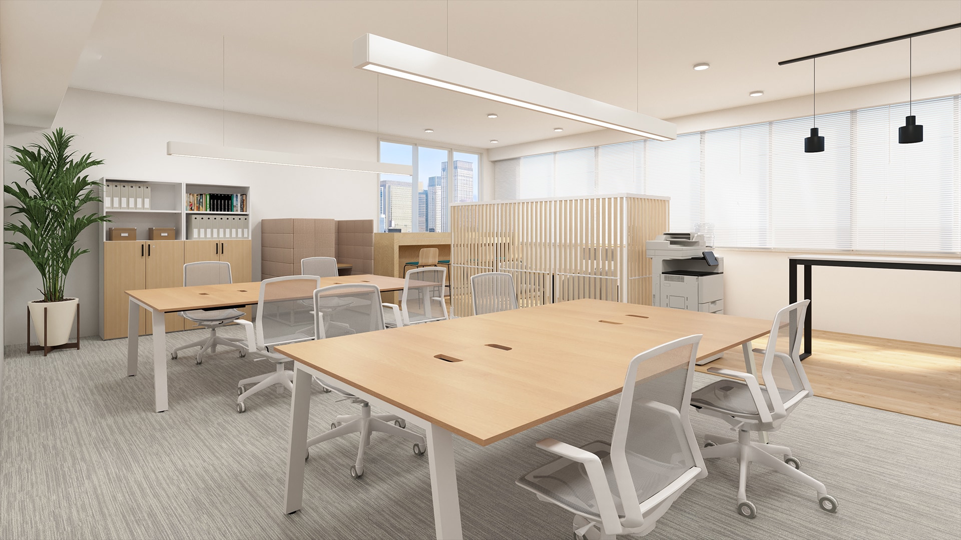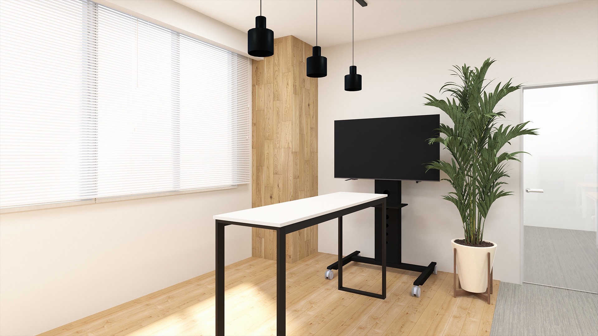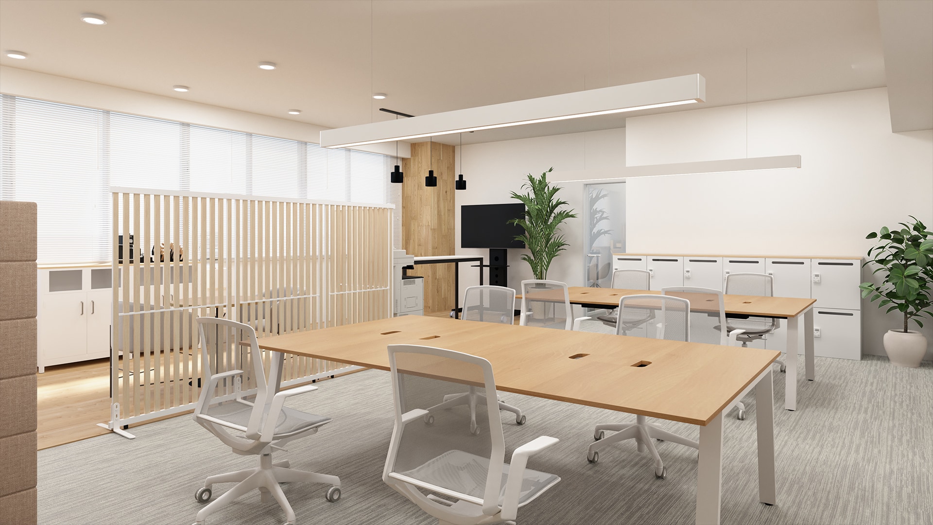 個別作業を両立するワークスペースこのワークスペースでは、個別作業とチームワークを両立できる環境を実現しています。オープンスペースにはフリーアドレスデスクを採用し、社員が業務内容に応じて自由に席を選択できます。また、スタンディングミーティングエリアを設けることで、チーム内の迅速な意思決定と円滑な情報共有を促進します。一方、個別ワークブースの設置により、集中して作業に取り組める環境も整備しました。このようなレイアウトにより、社員の働きやすさを高め、チームの連携強化と生産性向上に貢献します。