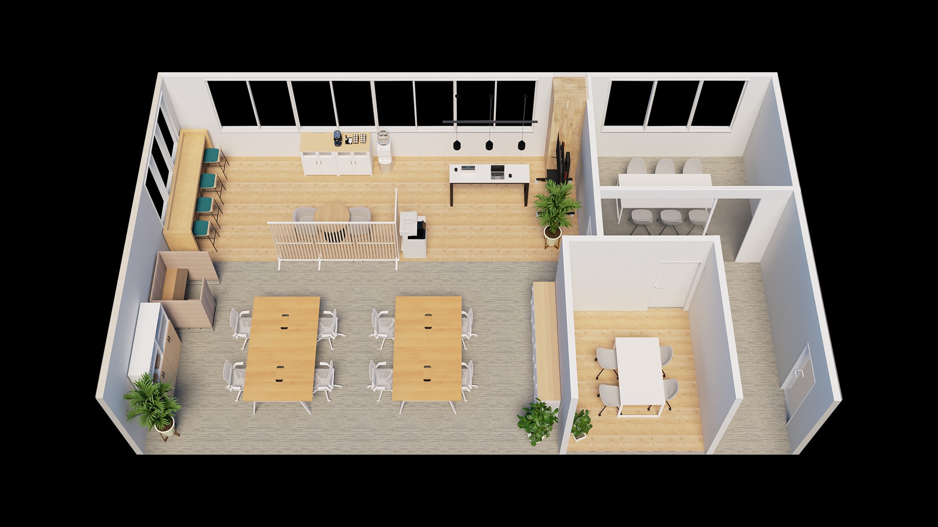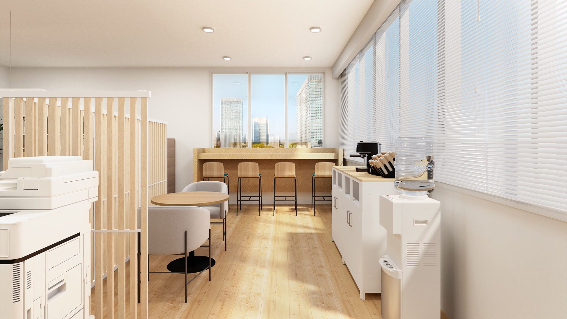 最適なレイアウトと動線設計このオフィスでは、業務効率を高め、無駄な動きを最小限に抑えるため、最適なレイアウトと動線設計を採用しています。エントランスからワークスペース、会議室への移動を効率化し、必要な設備やスペースを適切に配置することで、社員がスムーズに業務を進められる環境を提供します。来客と社員の動線を分けることで、クライアント対応を円滑にしながら、ワークスペースの集中環境も維持。ワークスペースはオープンスペースと個別作業エリアを適切に分け、個人作業とチームでの協働の両方に対応できる空間を整えています。さらに、自然光が差し込む明るい場所にリフレッシュスペースを設置。社員が仕事の合間にリラックスしたり、カジュアルなコミュニケーションを楽しんだりできる場となっています。