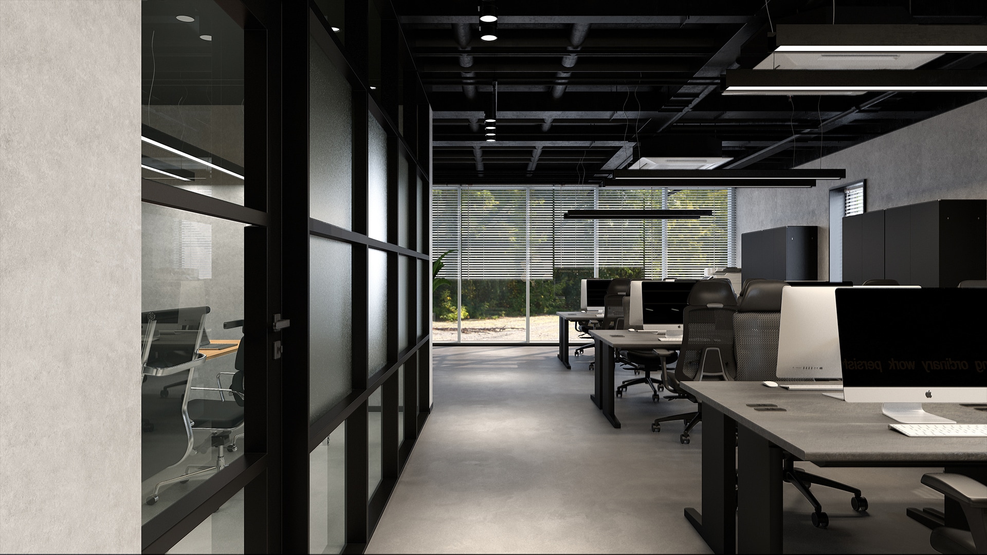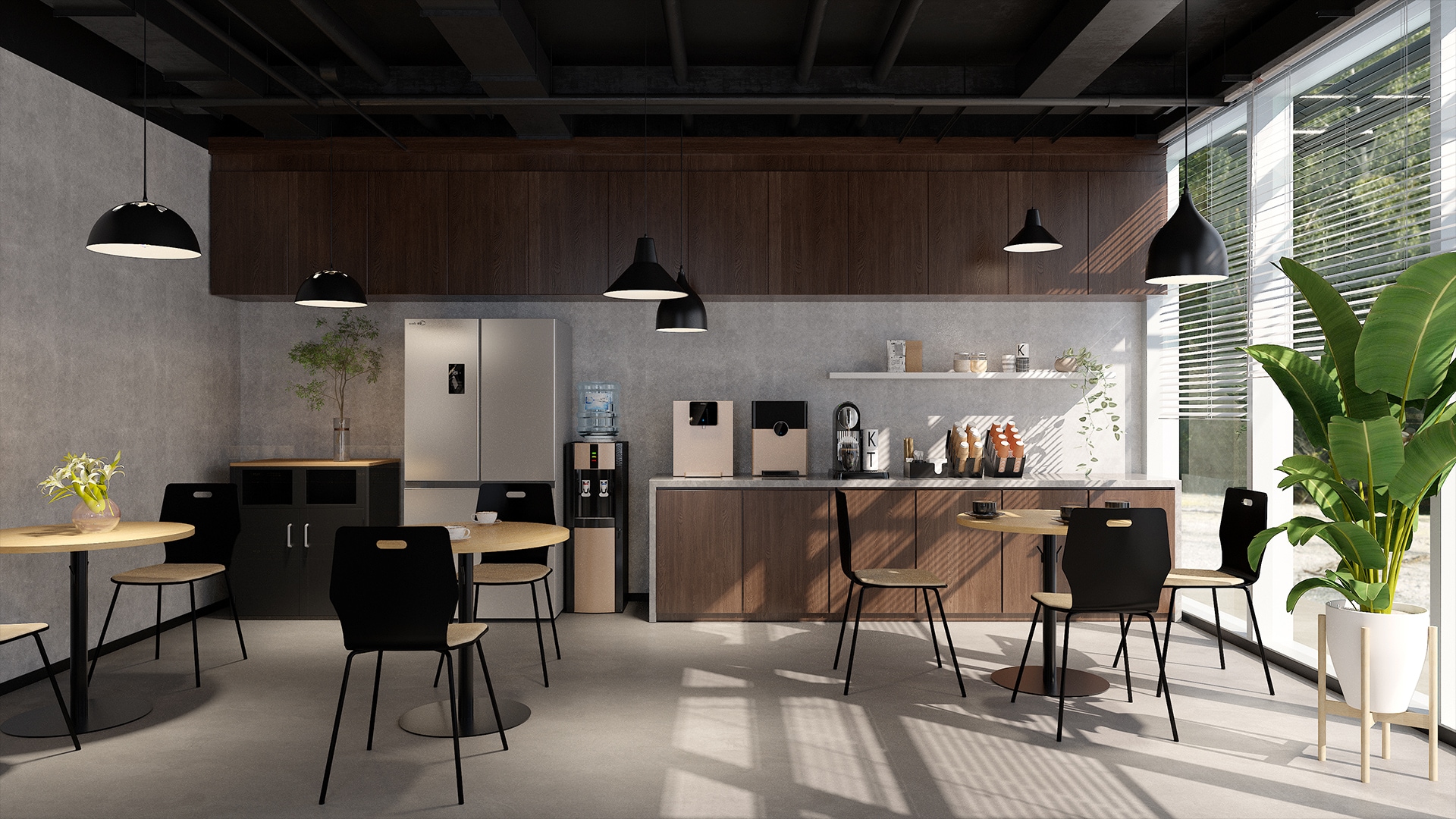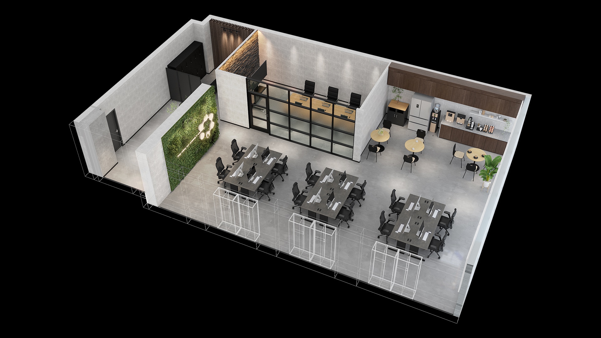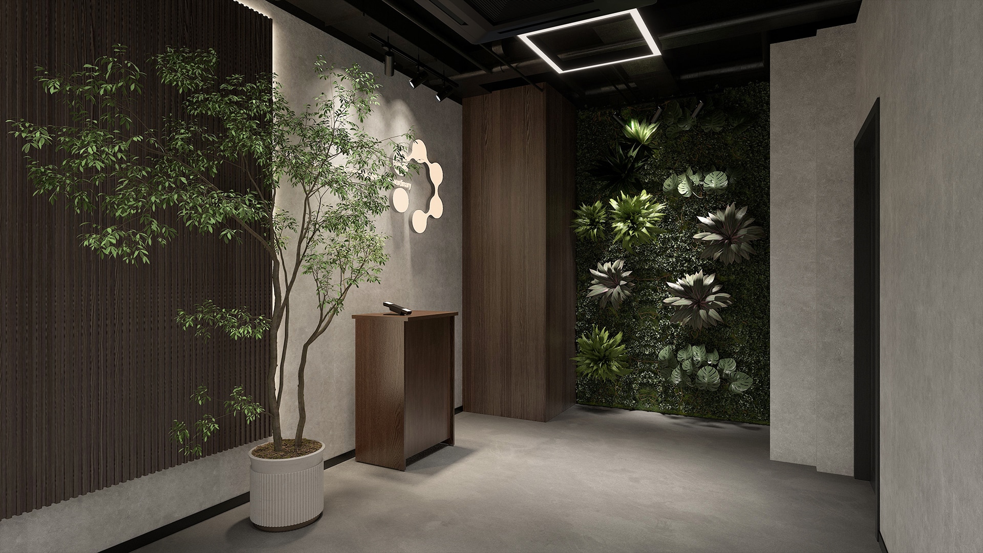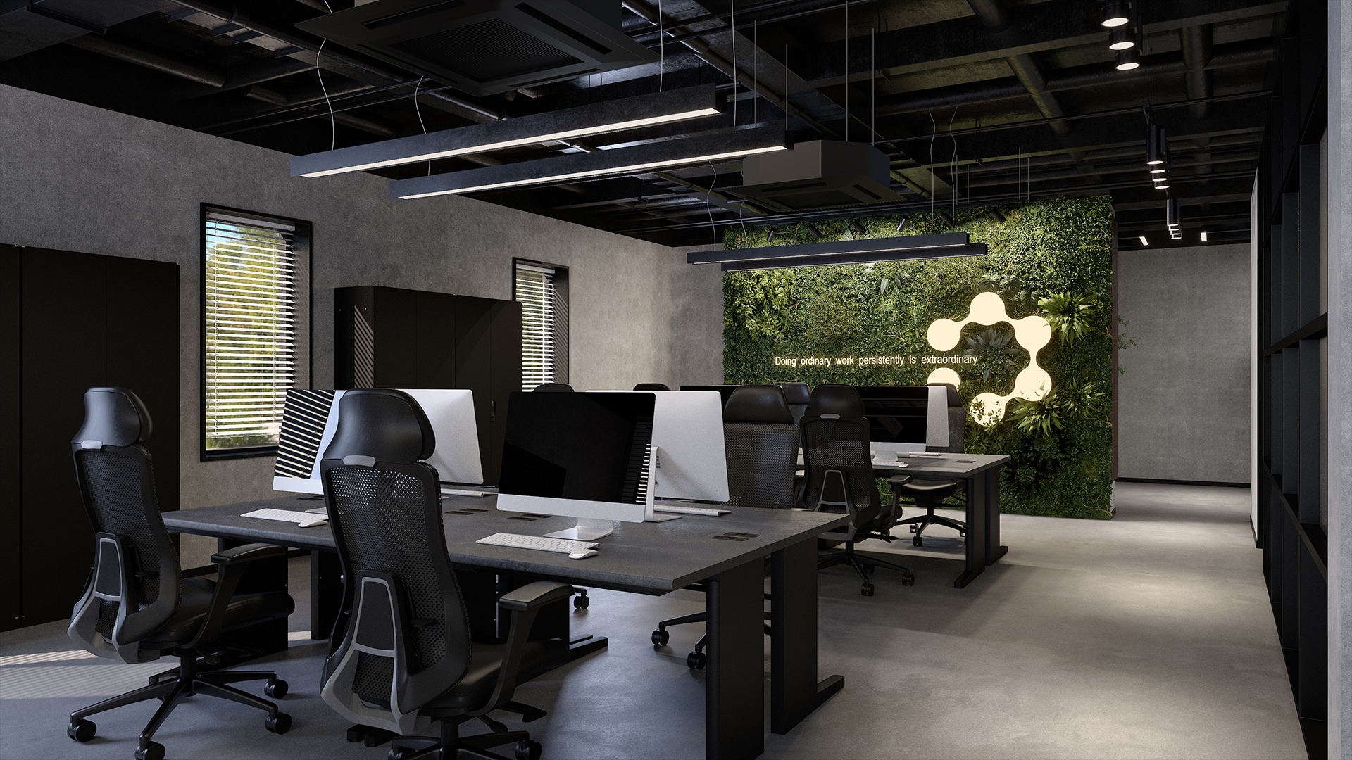 石目調デスクが魅力のワークスペース黒やグレーが基調の空間に、高機能チェア「AE-1」と上質な石目調天板の「EXデスク」が調和したシックな雰囲気のワークスペース。デスクは3つの島型に配置し、広めに設けた通路が快適な動線と作業に没頭できる理想的な環境を実現。奥にはグリーンウォールとブランドロゴの照明を設置して空間に自然なアクセントと癒しをプラス。さらに、ワークスペースの横には木目調家具とグリーンが配置されたカフェのようなリフレッシュスペースも併設。自然光がほどよく差し込み、リラックスしながら気分転換できます。