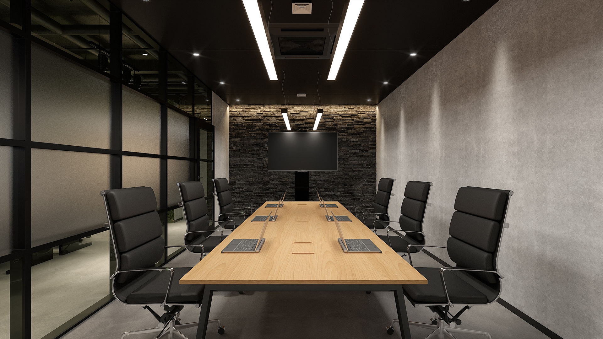 シックでデザイン性の高い会議室ブラック基調の内装と石目調のアクセントウォールが重厚感をもたらす6〜8人用のミーティングルーム。木目調のテーブルがシックな空間に温もりを加え、バランスの取れた雰囲気に仕上げています。また、デスク上に設置されたライン照明がプロフェッショナルな印象を与え、等間隔に配置されたダウンライトは落ち着きと上質さを演出します。防音効果のあるガラスパーテーションによる抜け感も魅力で、開放感とプライバシーの確保を両立。素材感と光の演出が絶妙に調和した、モダンでおしゃれな会議室です。