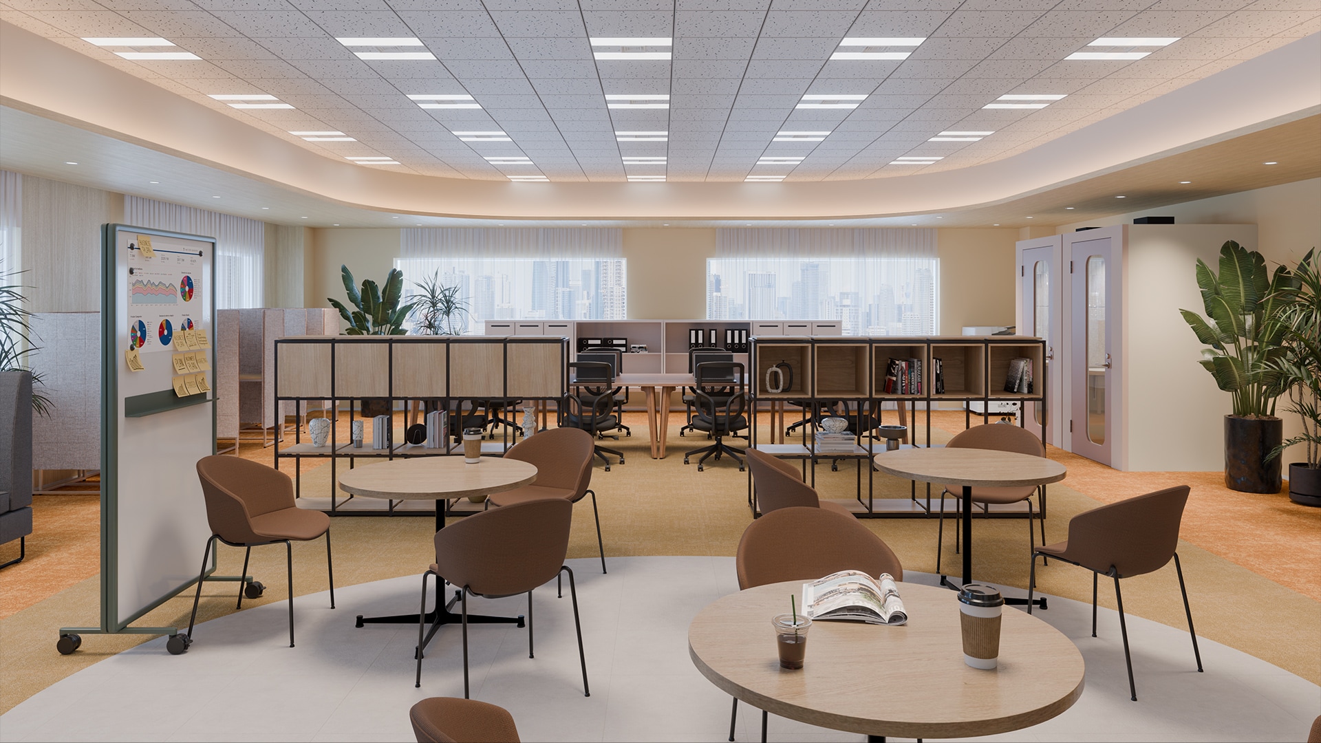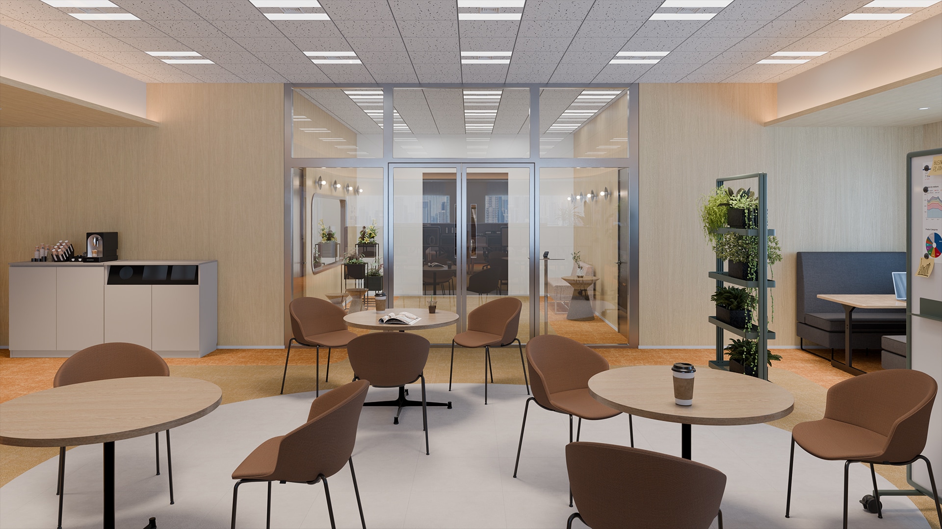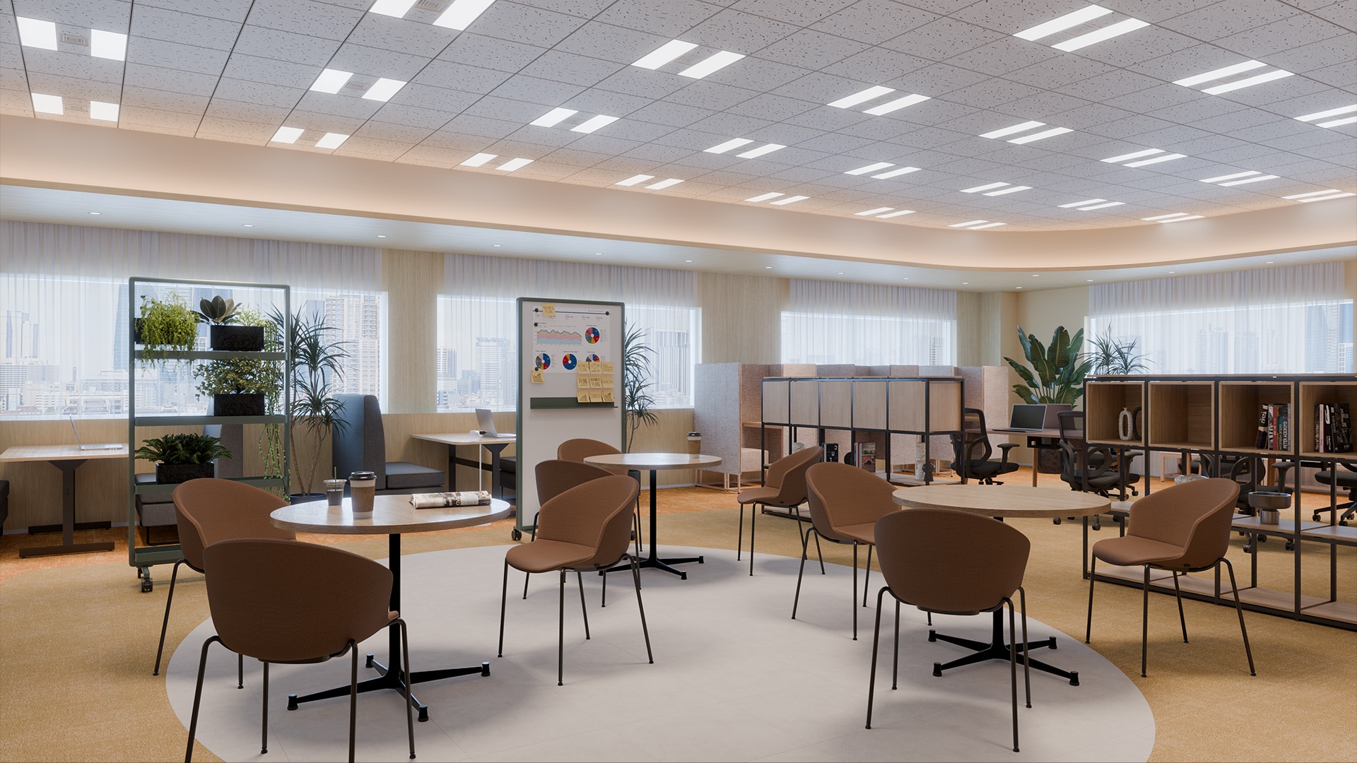 ラウンジ型リフレッシュスペースフロア中央には、円形のラグでゆるやかにゾーニングされたラウンジスペースを配置。丸テーブルとチェアが並び、コーヒーを片手に気軽な会話やちょっとした打ち合わせが生まれる場所になっています。周囲には植物を取り入れたシェルフや可動式のホワイトボードを配置し、雑談からアイデア共有へと自然に広がる環境を整備。執務席から少し離れた位置に設けることで、業務の合間に気分を切り替えながら交流できる場所となっています。チームの交流とリフレッシュを同時に支える、オフィスのハブとなる空間です。