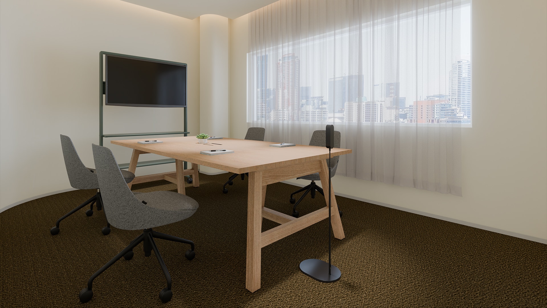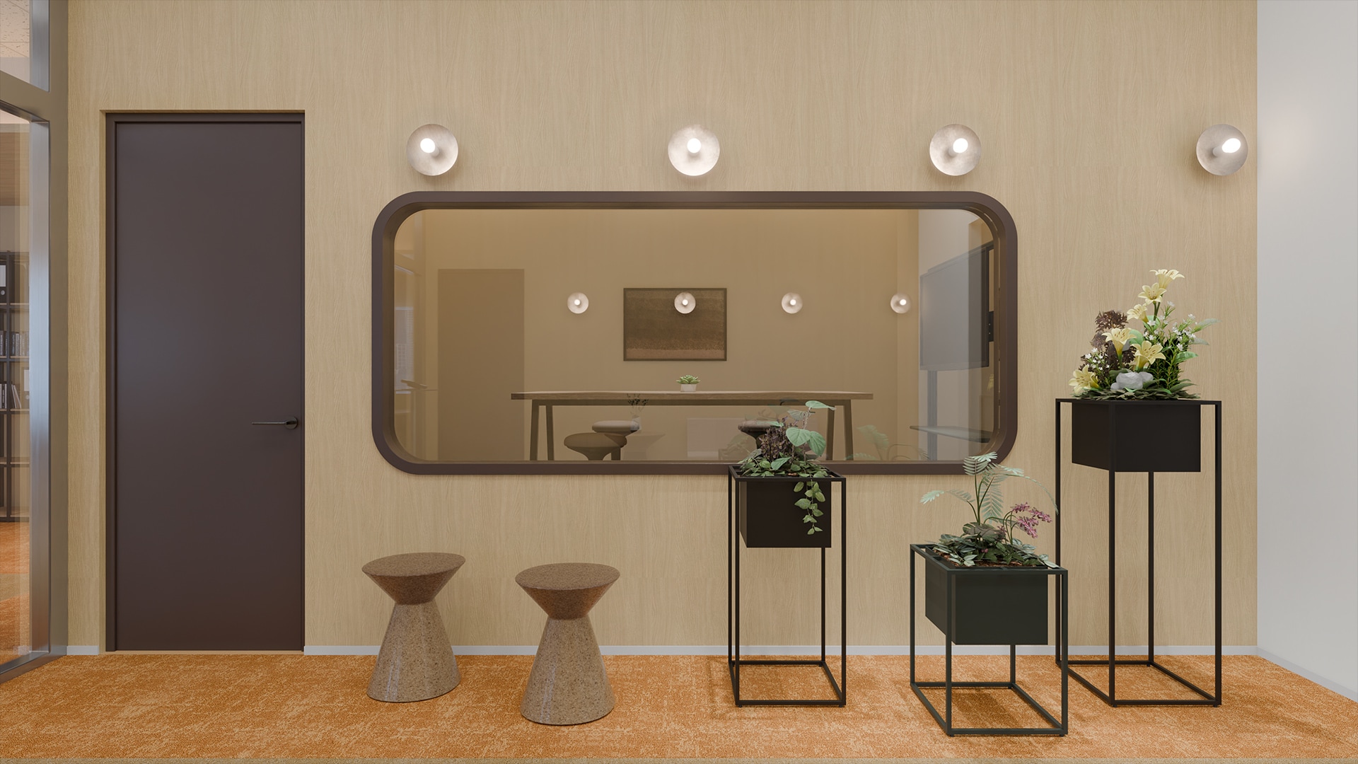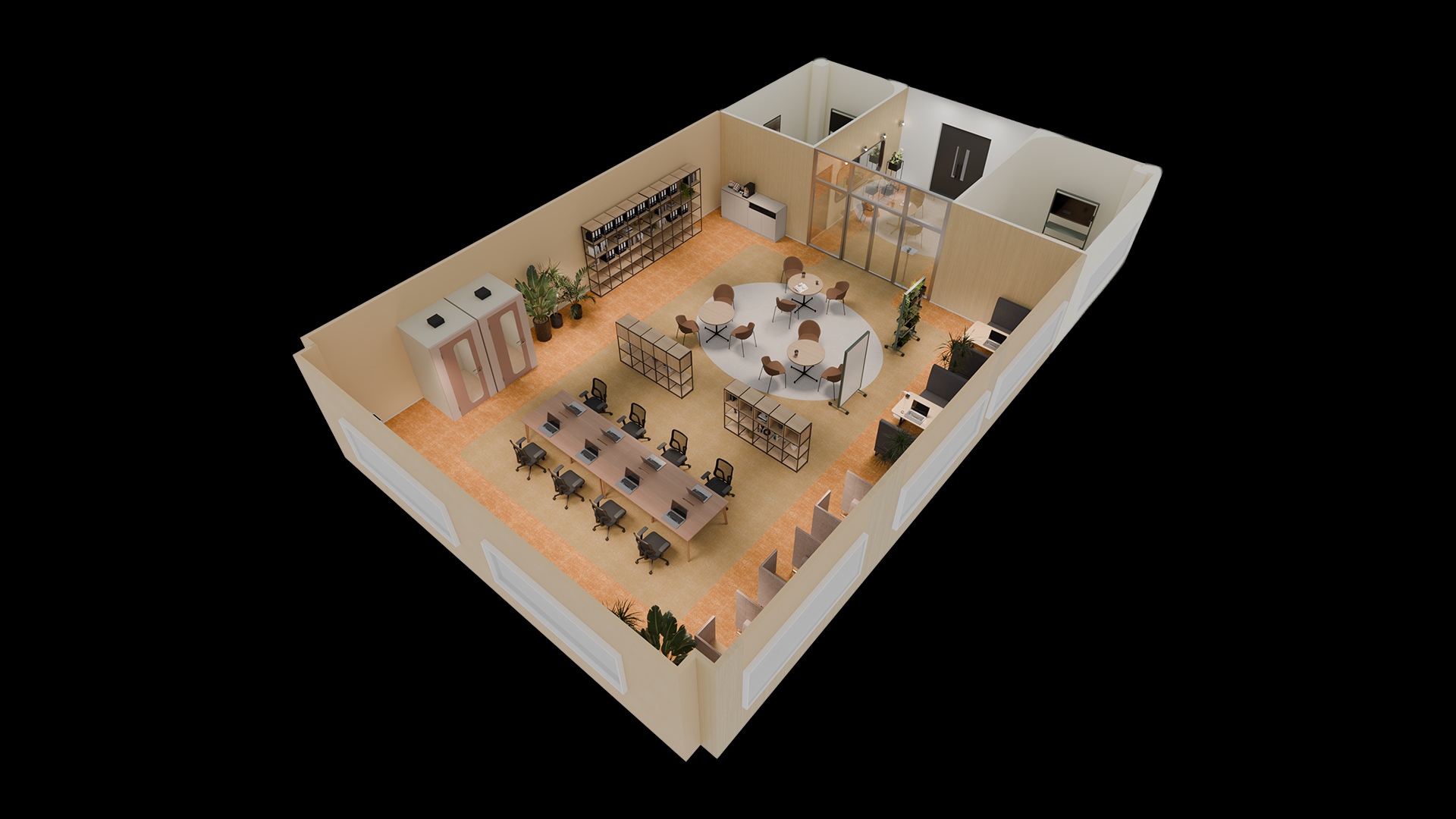 ラウンジ型リフレッシュスペースフロア中央には、円形のラグでゆるやかにゾーニングされたラウンジスペースを配置。丸テーブルとチェアが並び、コーヒーを片手に気軽な会話やちょっとした打ち合わせが生まれる場所になっています。周囲には植物を取り入れたシェルフや可動式のホワイトボードを配置し、雑談からアイデア共有へと自然に広がる環境を整備。執務席から少し離れた位置に設けることで、業務の合間に気分を切り替えながら交流できる場所となっています。チームの交流とリフレッシュを同時に支える、オフィスのハブとなる空間です。