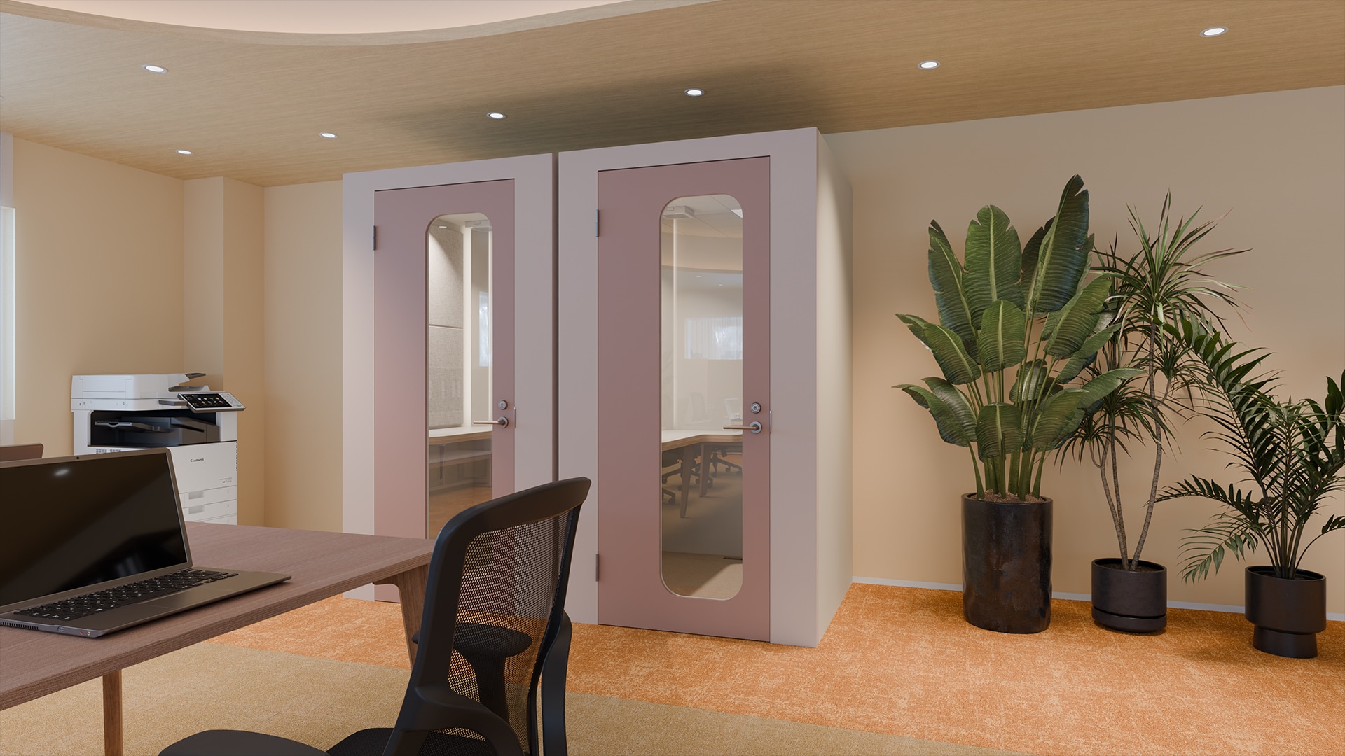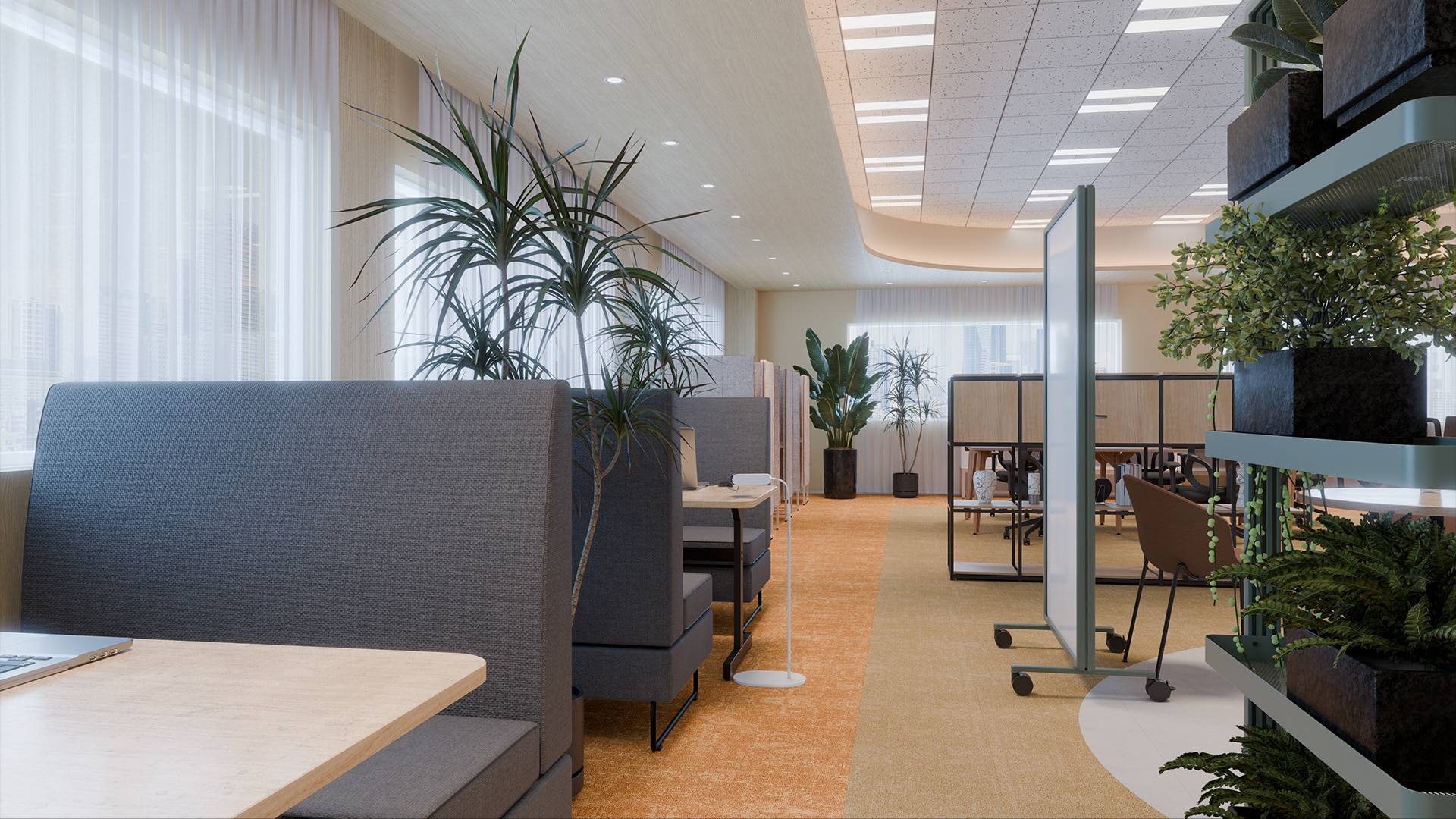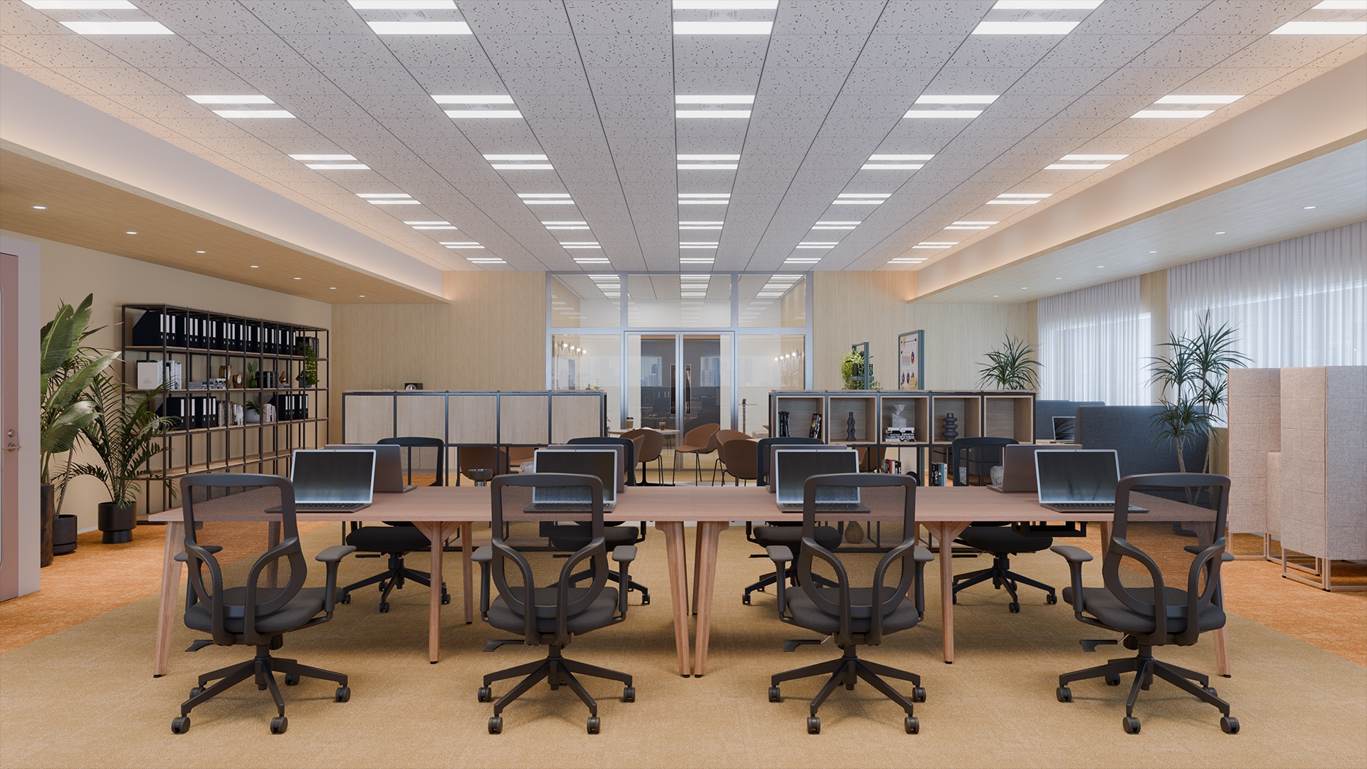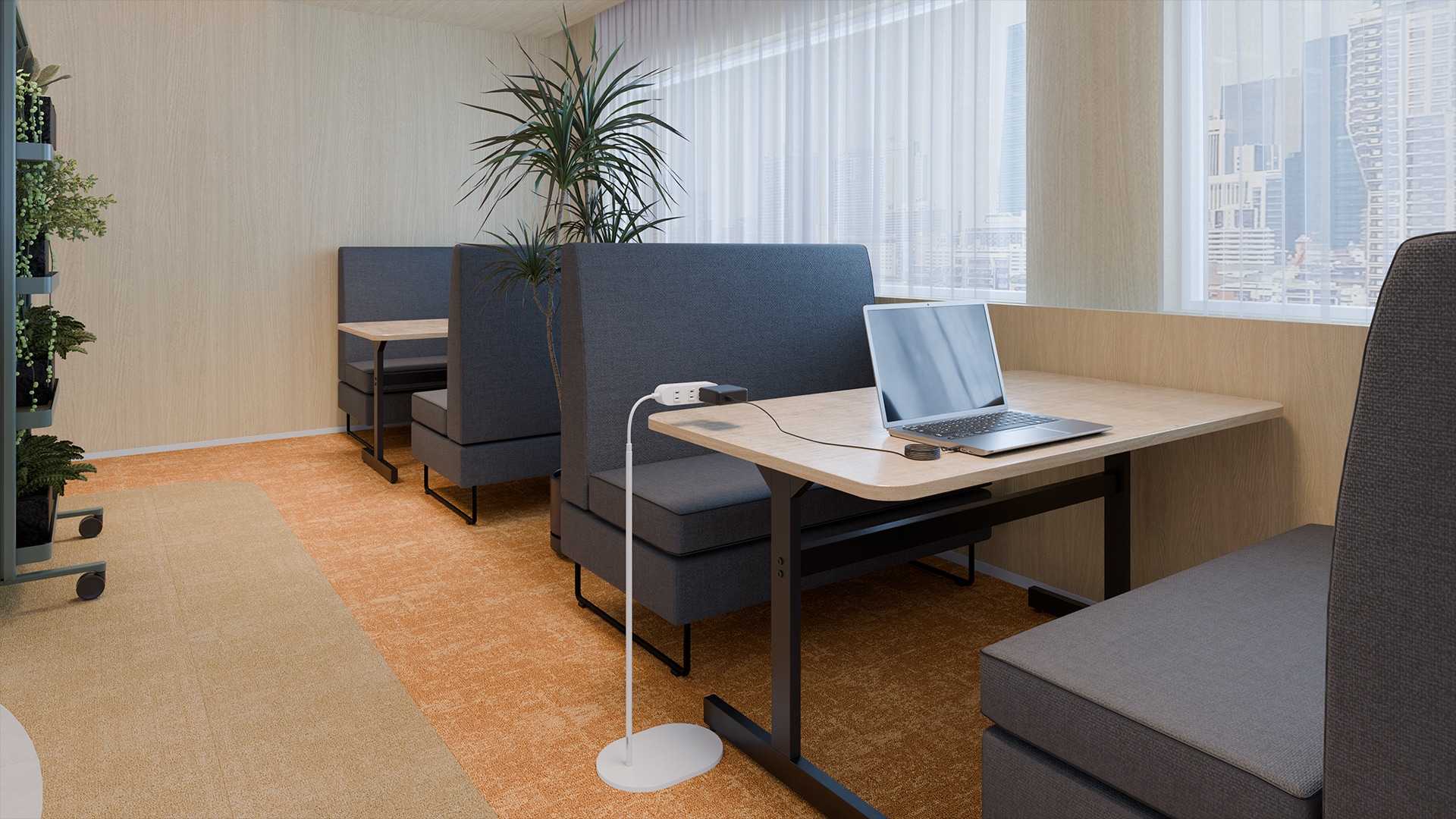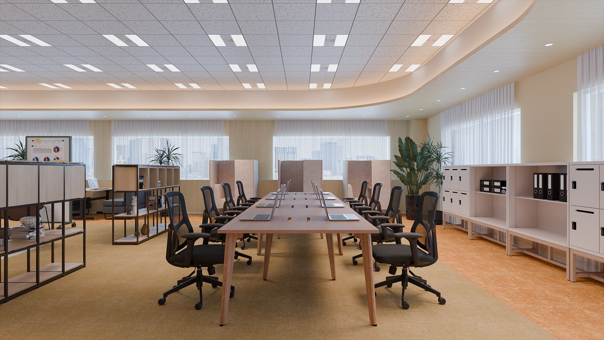 開放的なワークスペースデザイン木の質感を活かした長いデスクが並ぶワークスペースは、20人が柔軟に働けるフリーアドレス形式です。視界を遮らないレイアウトにより、チームの気配を感じながら作業できる開放的な執務環境が広がります。背後にはオープンシェルフや収納を配置し、視線を緩やかに区切りながら空間を整理。窓側にはハイバックソファ席や個室ブースが設けられ、集中作業やオンライン会議にも対応します。開放的な執務席と落ち着いて作業できる場所を用意することで、集中と対話を切り替えながら働ける環境を整えています。