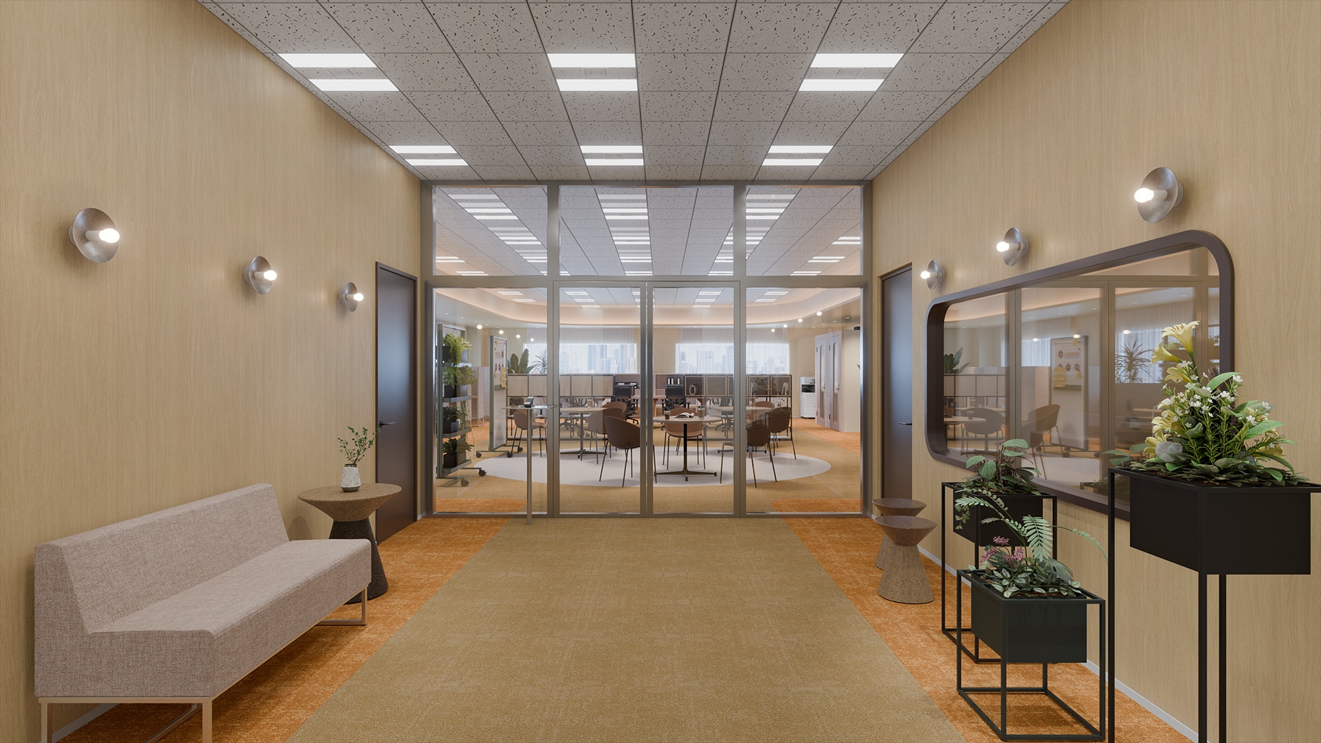 エントランス側の会議エリアから中央のラウンジスペース、そして奥へ広がるワークスペース。進むにつれて、空間は少しずつ開放的に広がります。ガラスの仕切りが視線をやわらかく通しながら、オフィス全体の活動の気配をつなぎ、ほどよい一体感を生み出しています。視線が抜けることで、空間の広がりも感じられるでしょう。