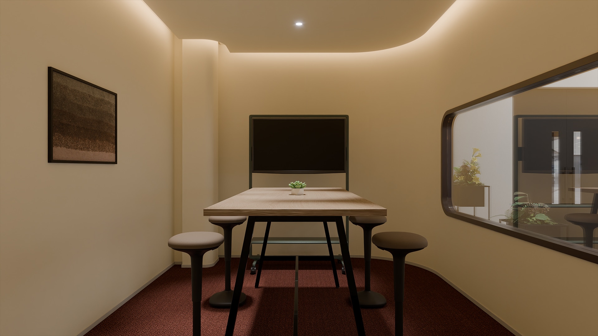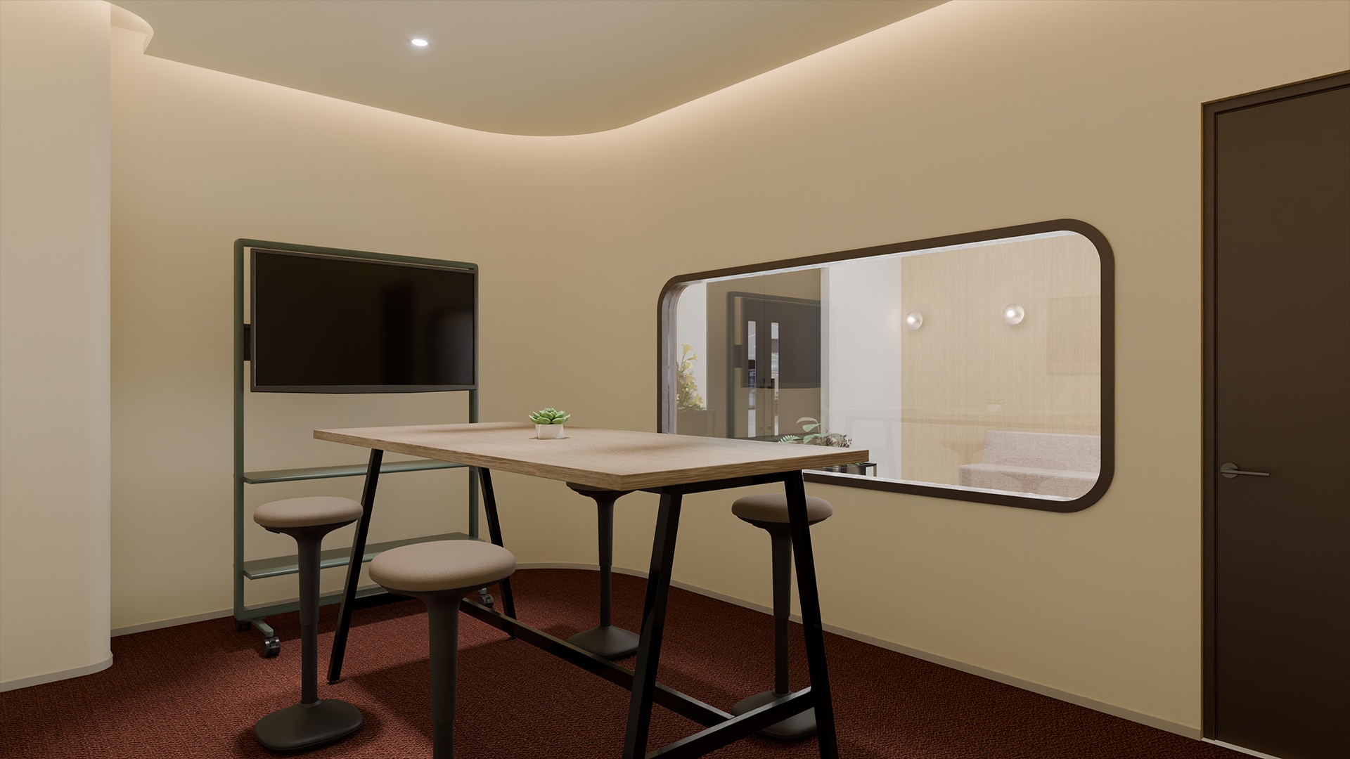 カジュアルミーティングスペースエントランス付近に設けられた会議スペースは、ガラス越しに内部の様子が見える設計。社員同士の打ち合わせを主に行う場所でありながら、会話や活動の様子が外にも伝わることで、来訪者に社内の活気ある雰囲気を自然に伝える空間になっています。ハイテーブルとスツールを組み合わせたレイアウトにより、立ったり腰掛けたりと姿勢を変えながら会話できるのも特徴です。短時間の打ち合わせやアイデア共有など、気軽に集まって対話できるカジュアルなミーティング環境をつくり出しています。