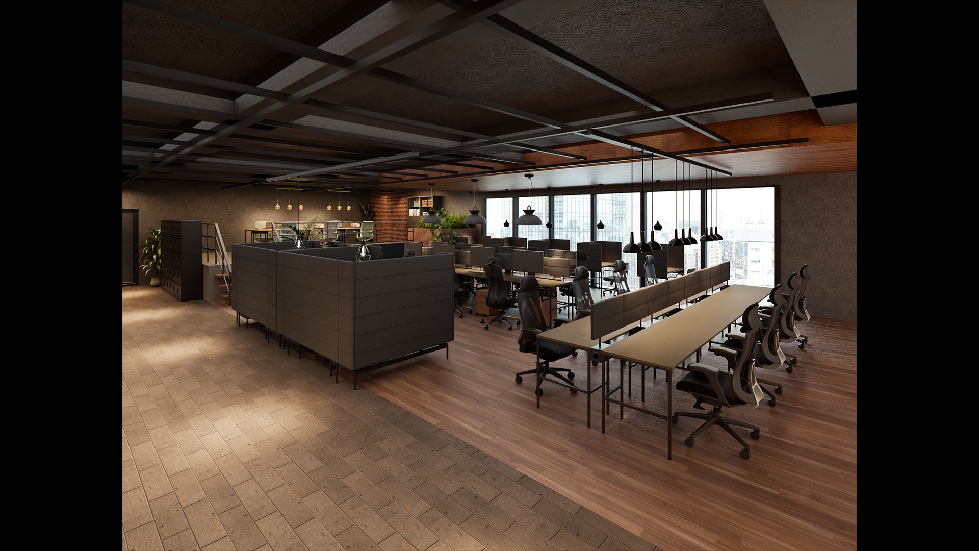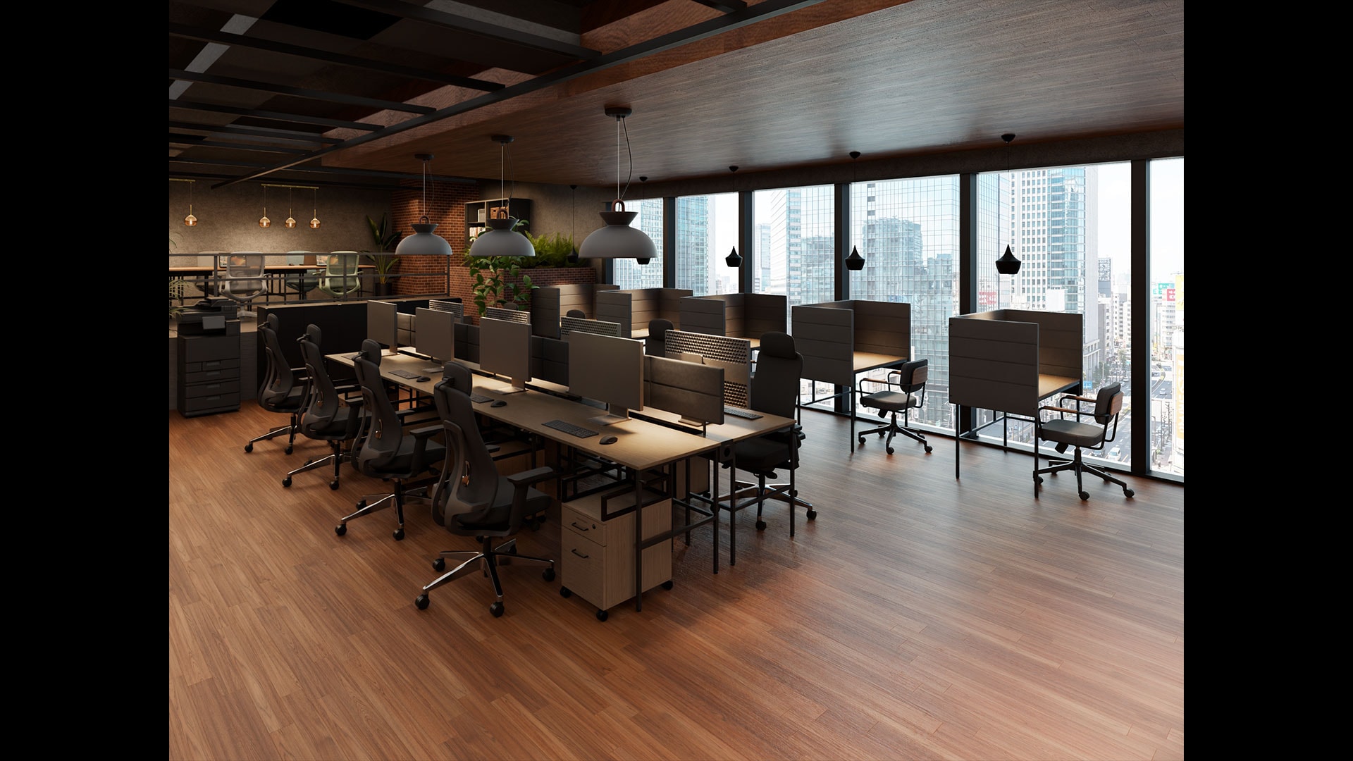 本記事では、カフェのような温かみとABW(Activity Based Working:業務内容や目的に応じて働く時間・場所を自由に選べる働き方)の機能性を融合した、65坪・20人用オフィスレイアウトをご紹介。空間全体に適度なおこもり感と安心感をもたらす、木目とブラックを基調にした落ち着いたトーンが魅力です。中央の大型フリーアドレスデスク、窓際のパネル付きデスク、モンタージュソファの半個室席、カフェカウンターなど、多様な働き方を受け止めるゾーニングで生産性とリラックス性を両立。オフィス家具には「調和のとれた、かっこいい基地づくり。」をコンセプトとするensemblebaseを採用し、統一感のあるトータルコーディネートを実現しています。“集中とリラックス”“個人とチーム”を無理なく切り替えられるレイアウトで、働く人が快適に過ごせる基地のようなオフィスを目指しました。