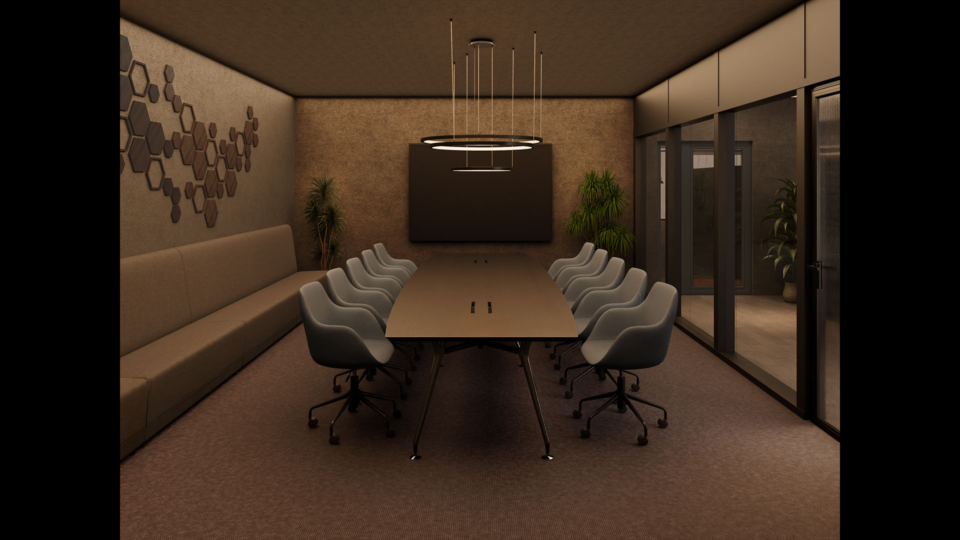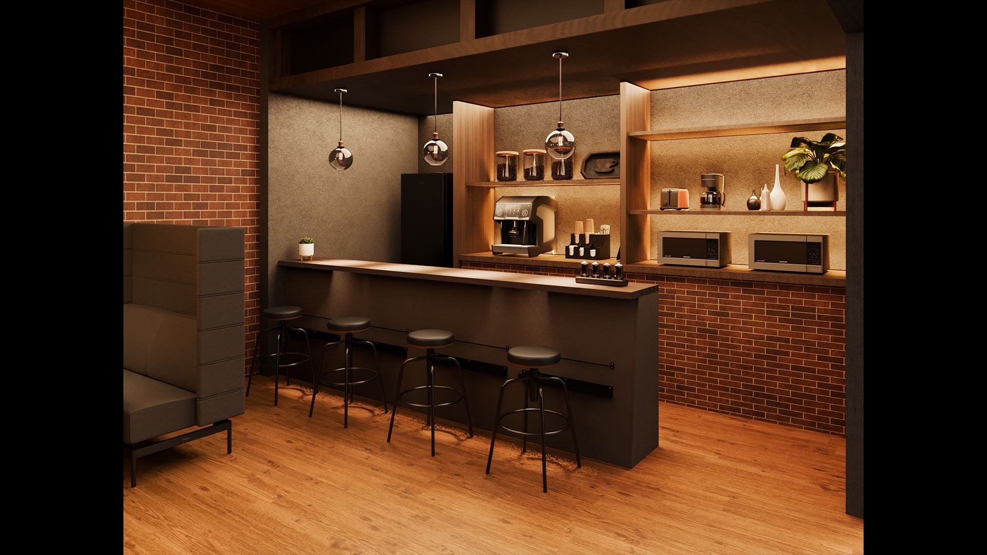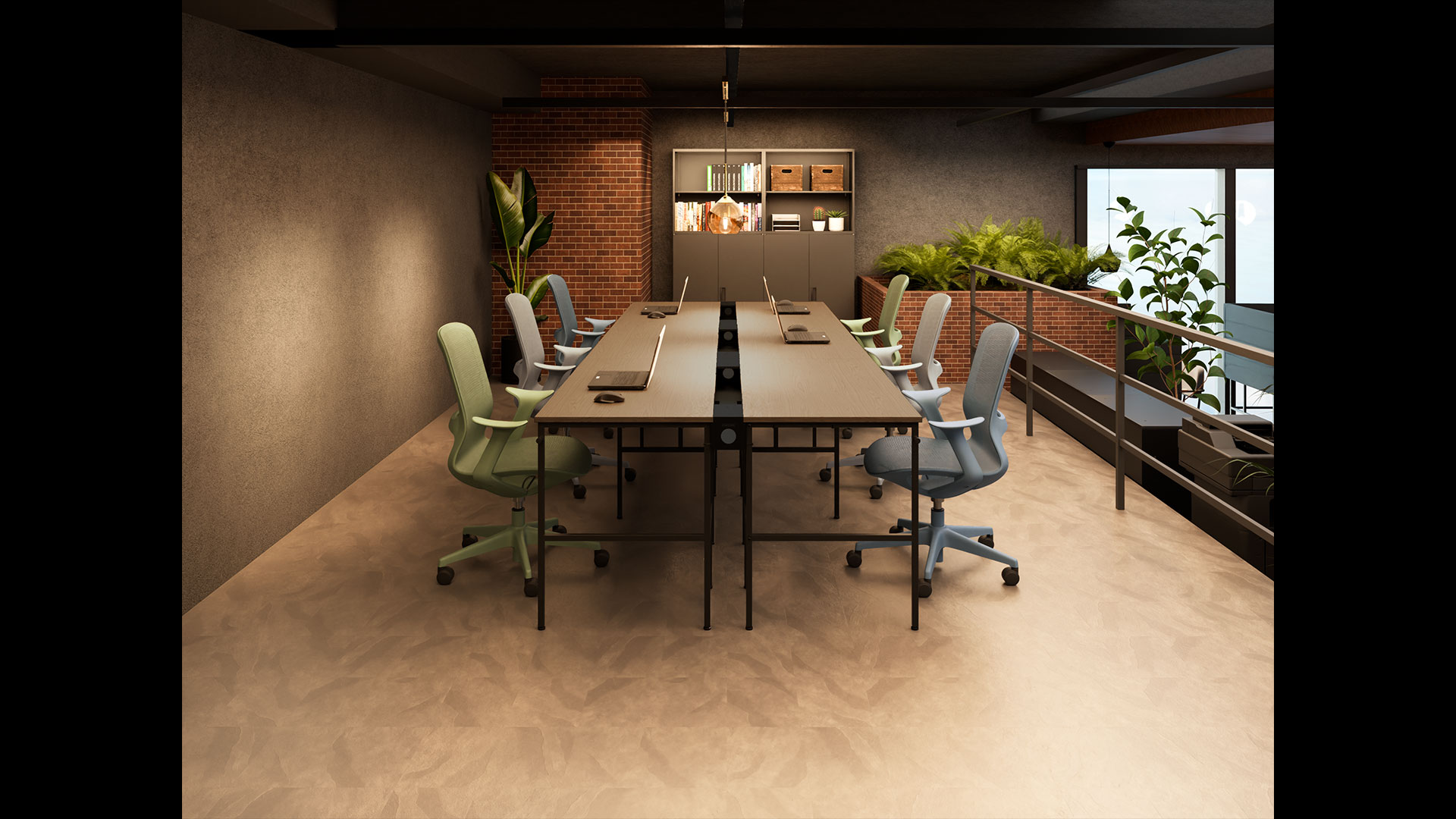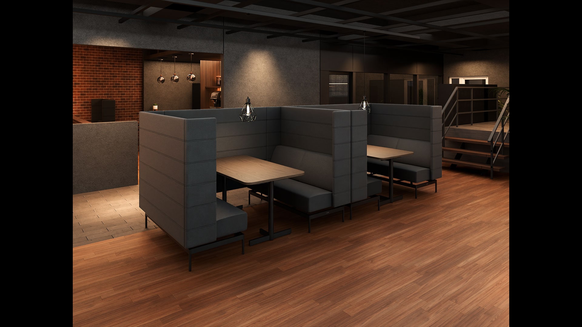 カフェライクなソファブース席温かい照明が映えるブース席は、ensemblebaseのモンタージュソファによる“半個室感”と上質なファブリックによる柔らかな座り心地が魅力。高さ1400mmのハイバックパネルが頭までしっかりと隠し、商談・1on1・簡易ミーティング・休憩など幅広いシーンで活躍。カフェのようにくつろげる空間は心理的負担を軽減し、思考の切り替えやアイデア出し、気軽なコミュニケーションを促進。中央の島席から移動しやすい位置関係で、ABWの核である“用途で席を選ぶ”を体感的に後押しします。