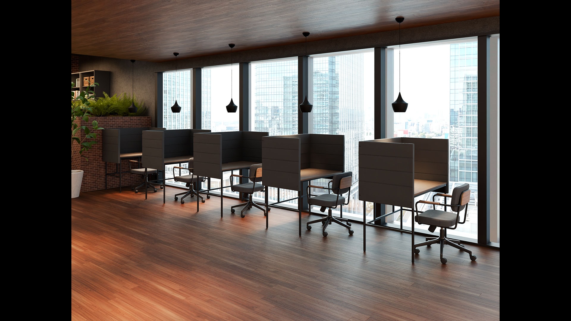 窓辺のパネル付き1人ワーク席窓際に配置したensemblebaseのパネル付きデスクは「短時間で一気に集中したい」「周囲の視線を遮りたい」というニーズに応えるスポットとして機能。三方向のパネルが程よい囲いを生み、視界のノイズを大きく低減します。奥行640mmの広々天板はストレスフリーな作業を叶え、配線用スリットがケーブル類をスマートに収納。テレワークに近い“個人空間”を社内で確保できるため、資料作成やオンライン会議など高集中タスクに活躍。日中は自然光が心地よく、静かにこもれる快適なミニブースです。