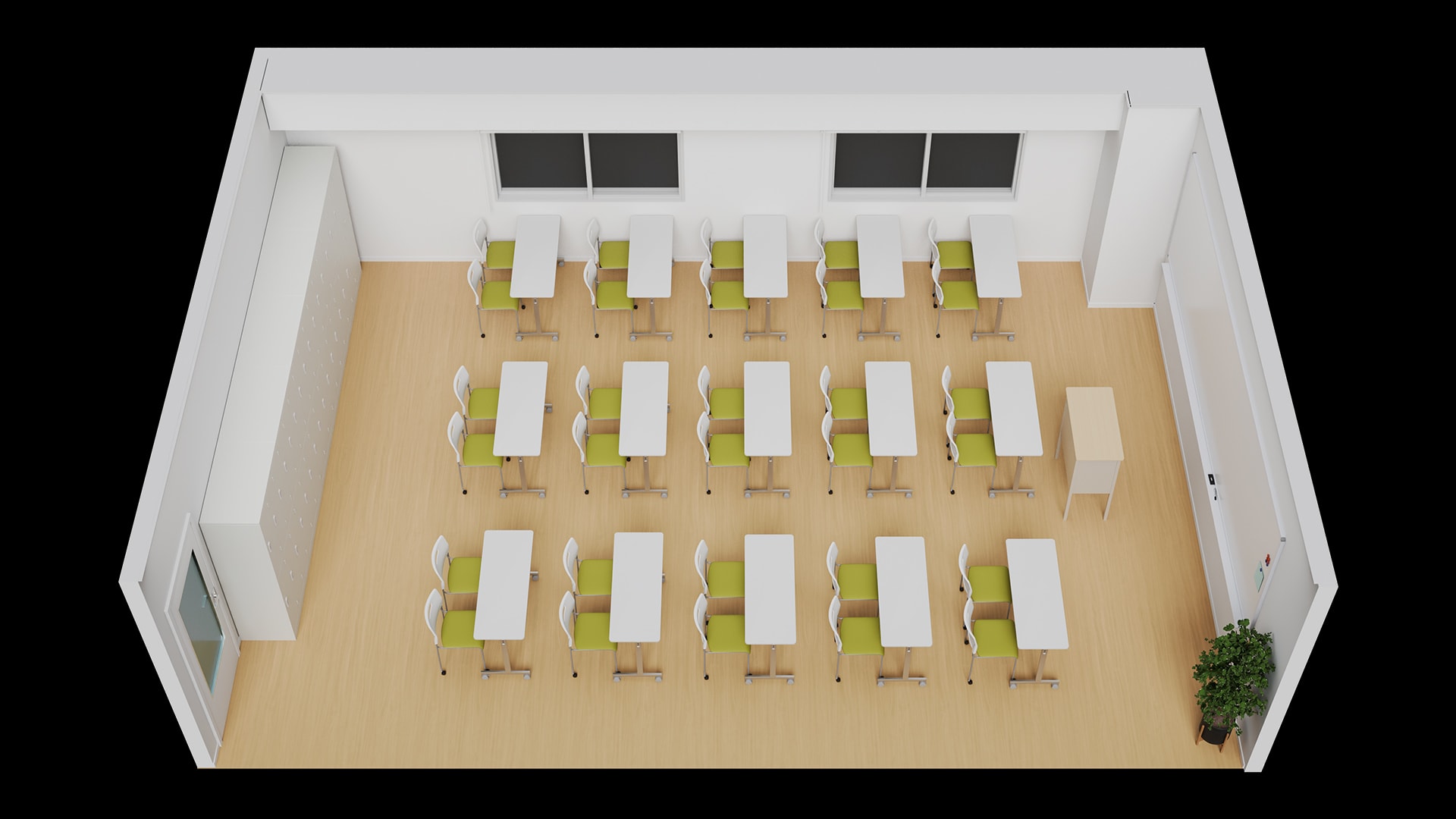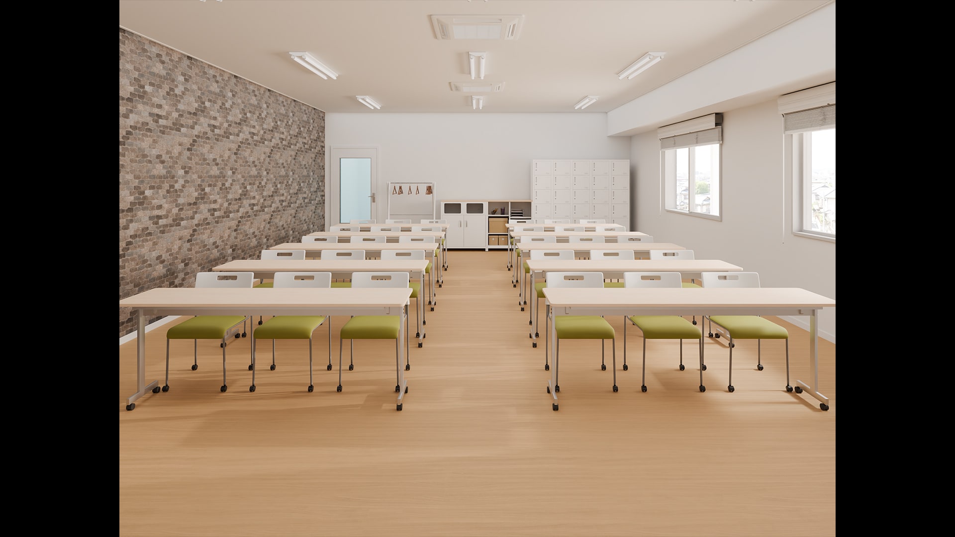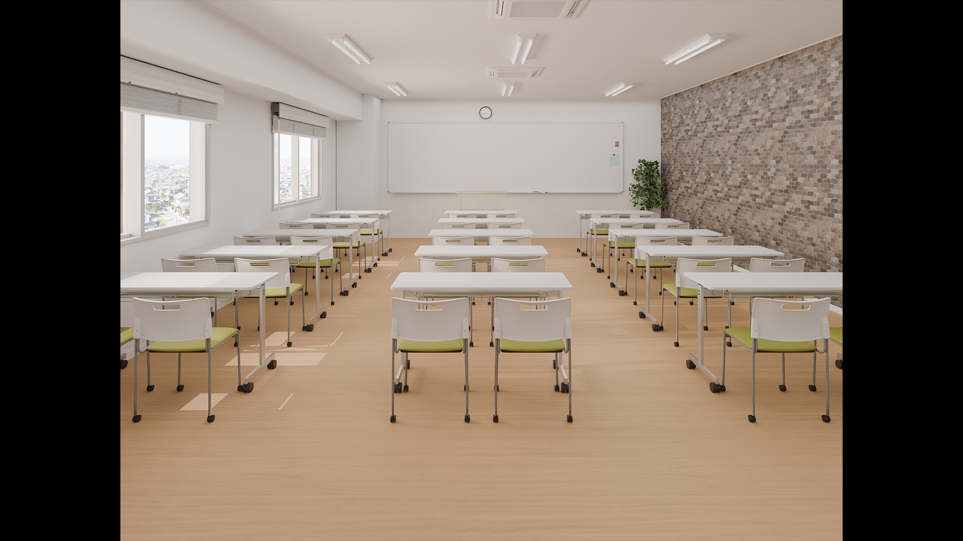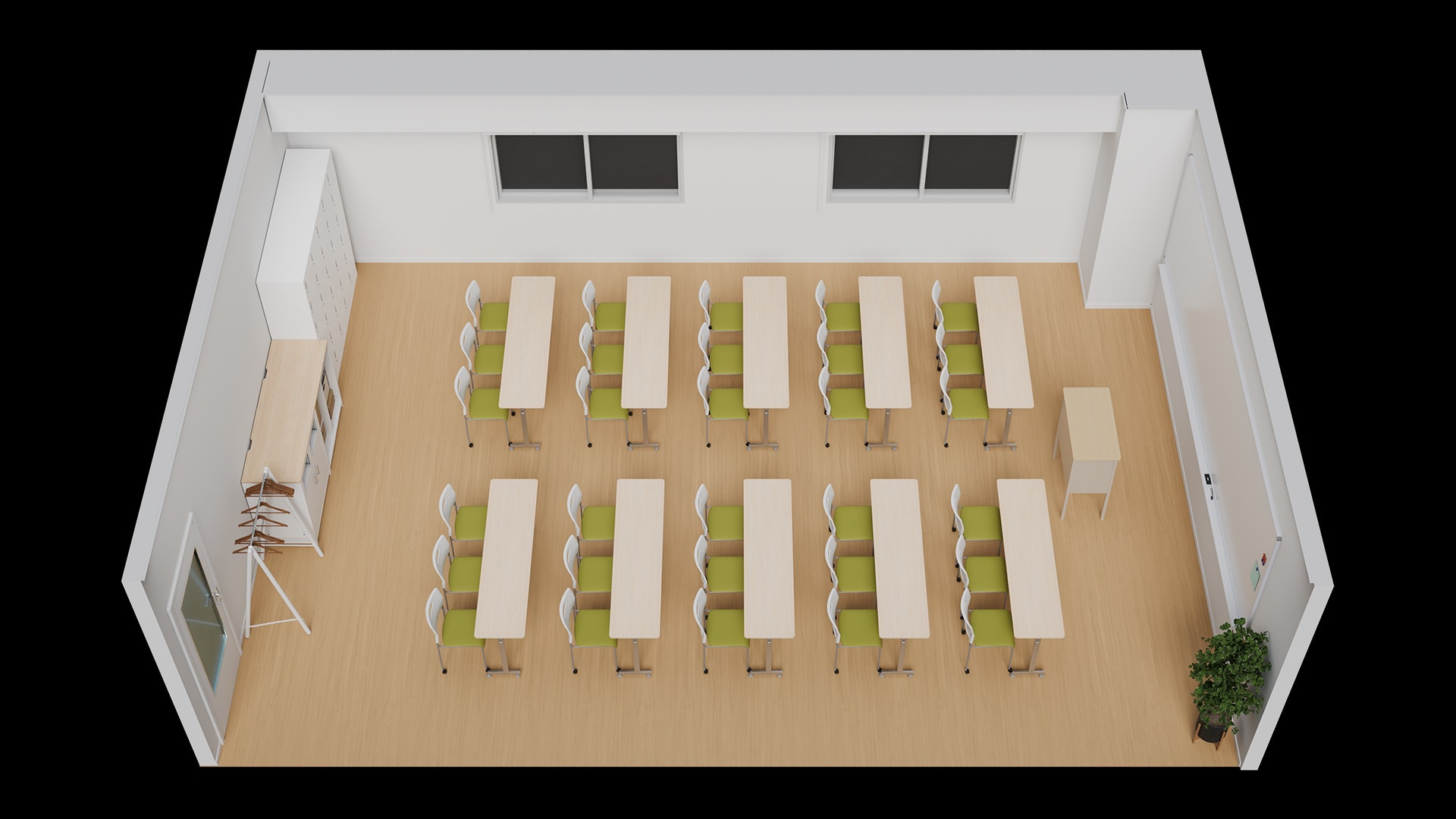 本記事では、17坪(約35畳)という限られた広さの中で、20人の利用に対応できる可変型の教室レイアウト事例をご紹介します。ナチュラルかつ明るいトーンで統一した空間は、圧迫感を抑えながらも、学習に集中しやすい雰囲気を実現。機動性の高いスタッキングテーブルを活用することで、ゆとりを重視した配置から席数を確保するレイアウトまで、目的に応じて柔軟に切り替えられる点が大きな特長です。利用シーンや人数変動に合わせて組み替えやすいため、学習塾や講習スクールのレイアウトを検討している運営者にとって、すぐに取り入れやすい実用的な設計といえるでしょう。以下では、17坪のスペースを活用した「天板サイズ別のレイアウトパターン」を3つご紹介します。
