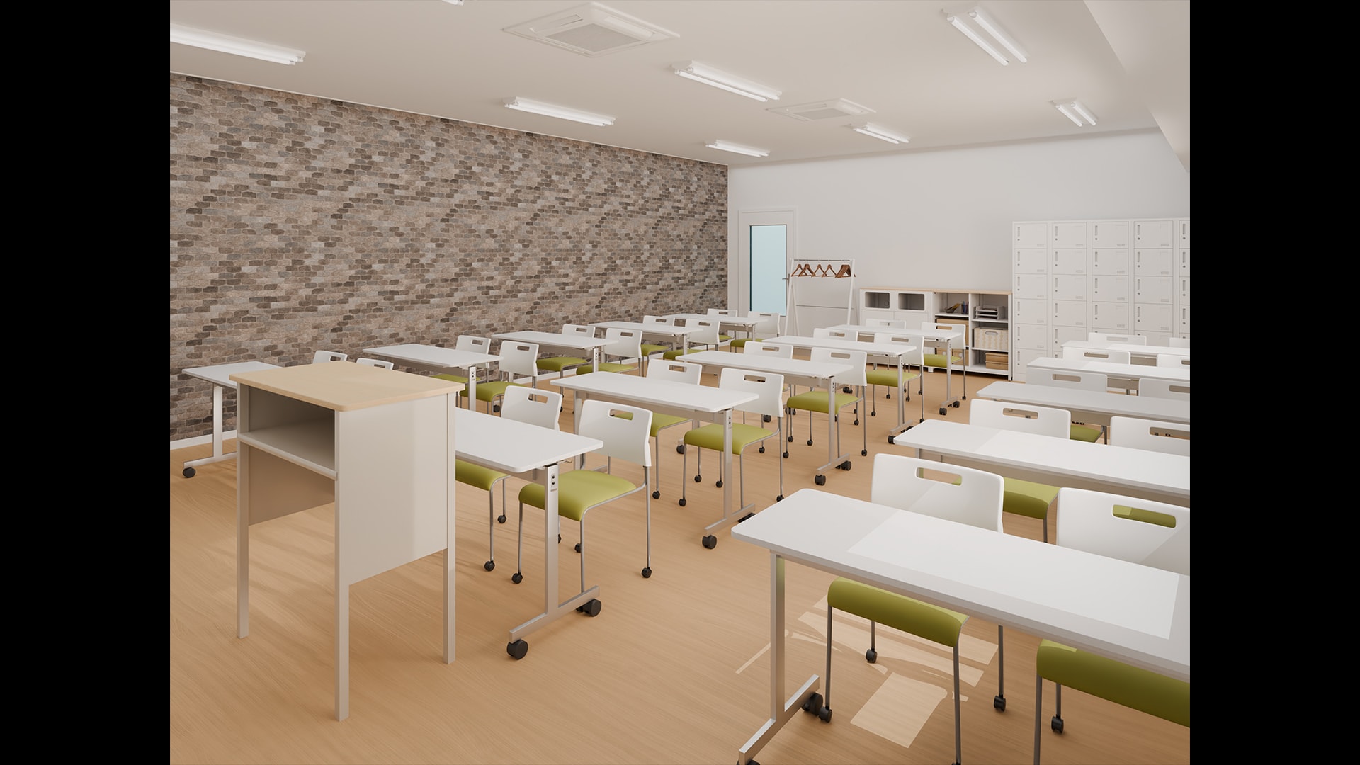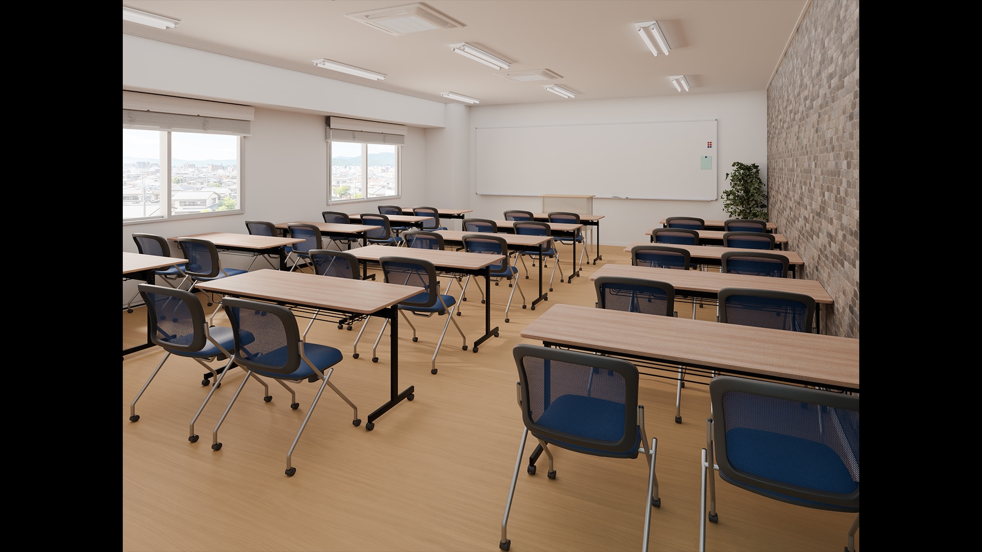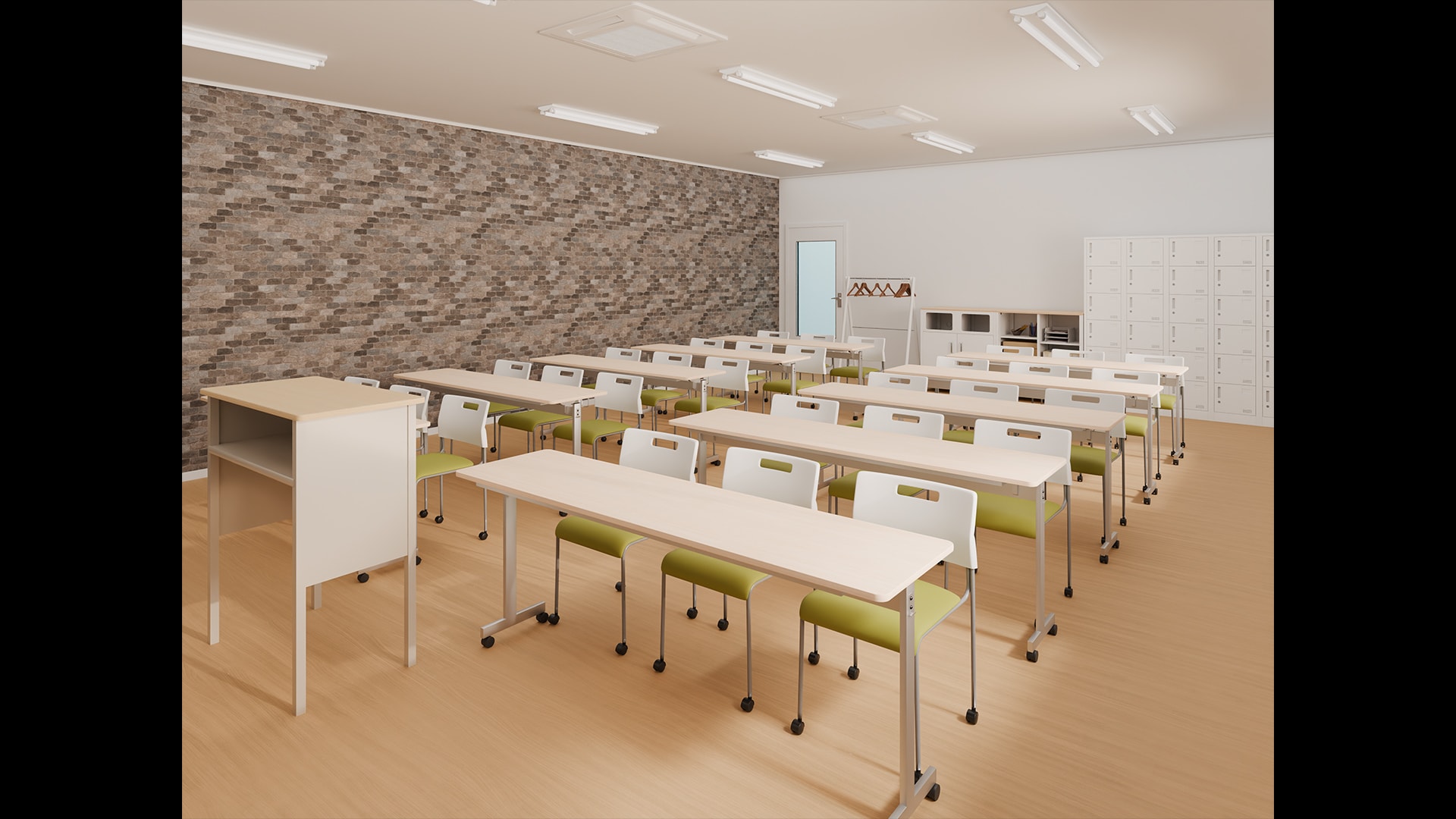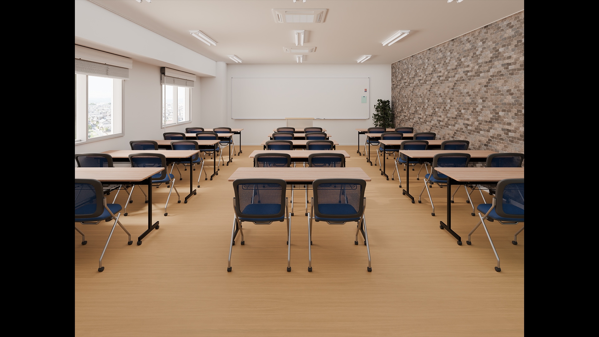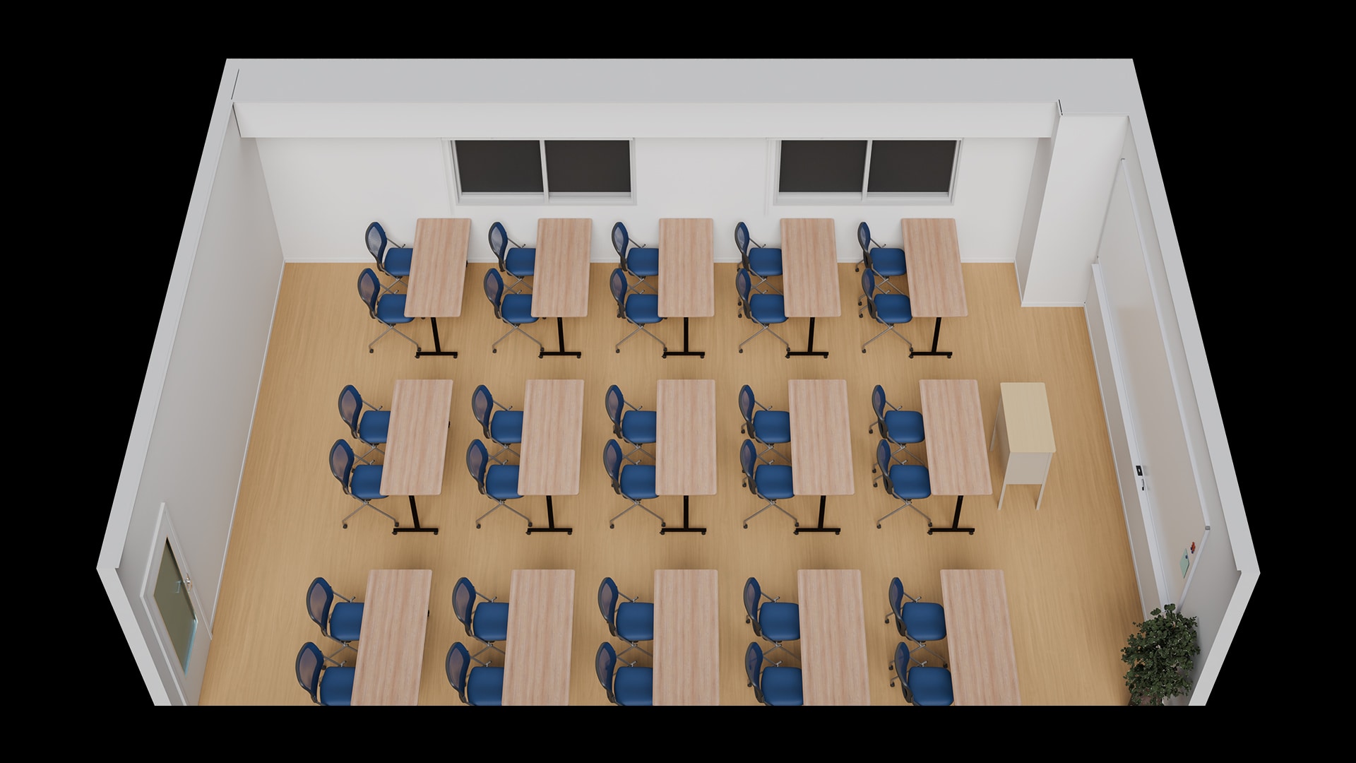 本記事では、17坪(約35畳)という限られた広さの中で、20人の利用に対応できる可変型の教室レイアウト事例をご紹介します。ナチュラルかつ明るいトーンで統一した空間は、圧迫感を抑えながらも、学習に集中しやすい雰囲気を実現。機動性の高いスタッキングテーブルを活用することで、ゆとりを重視した配置から席数を確保するレイアウトまで、目的に応じて柔軟に切り替えられる点が大きな特長です。利用シーンや人数変動に合わせて組み替えやすいため、学習塾や講習スクールのレイアウトを検討している運営者にとって、すぐに取り入れやすい実用的な設計といえるでしょう。以下では、17坪のスペースを活用した「天板サイズ別のレイアウトパターン」を3つご紹介します。