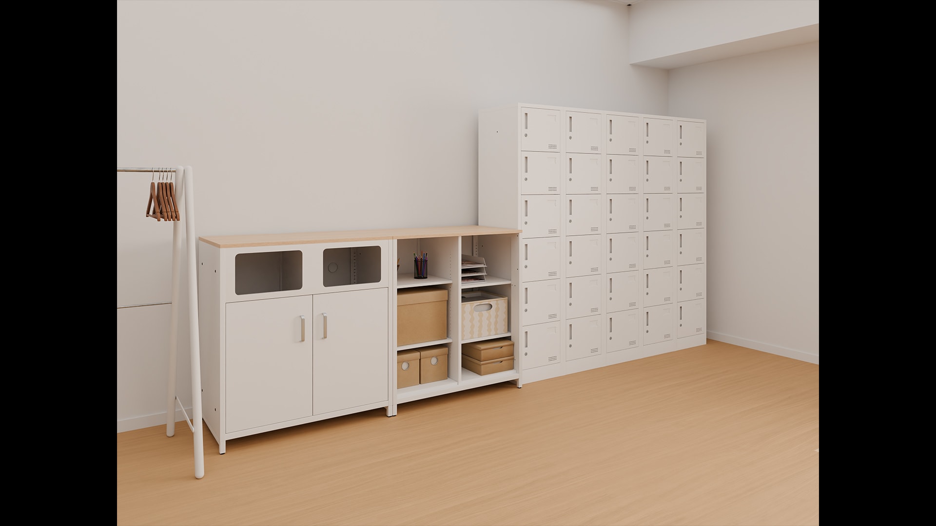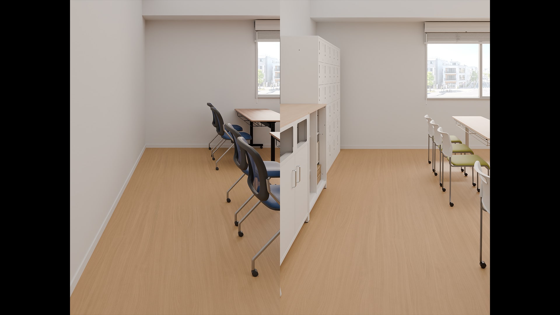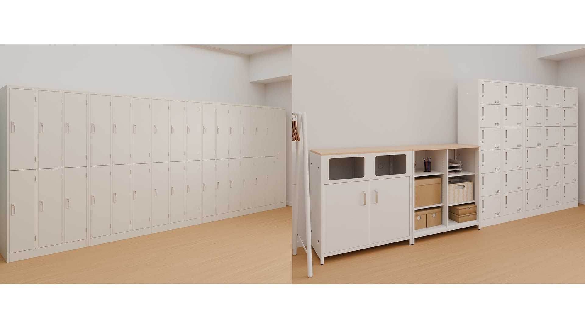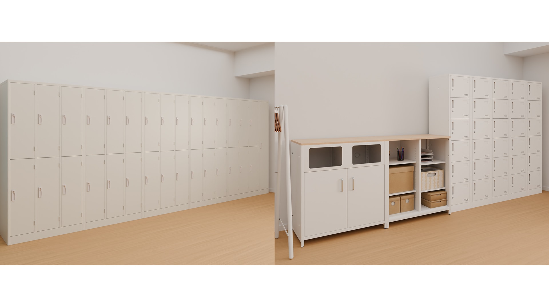 可変型収納ゾーン設計レイアウトの工夫により、教室後方には広いフリースペースを確保。大容量ロッカーを並べる構成から、コンパクトな貴重品ロッカー+オープン棚の組み合わせまで、用途に応じた設計が可能です。教材や備品、生徒の私物を整理して教室内を常にすっきりと保つことは、快適性や運営効率を高めるポイント。組み合わせ自由な収納家具を採用することでロッカータイプの変更やロッカー数の増減も行いやすく、将来的な増員やクラス編成の変更にも対応可能。柔軟性を備えた学習塾レイアウトの好事例です。