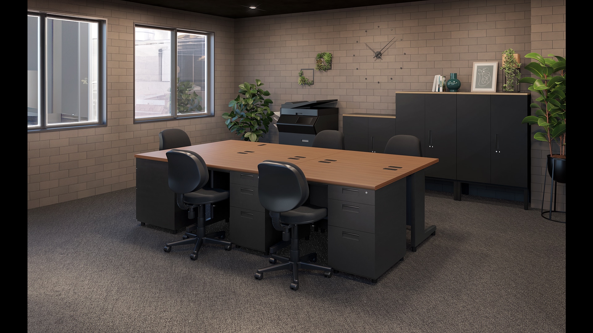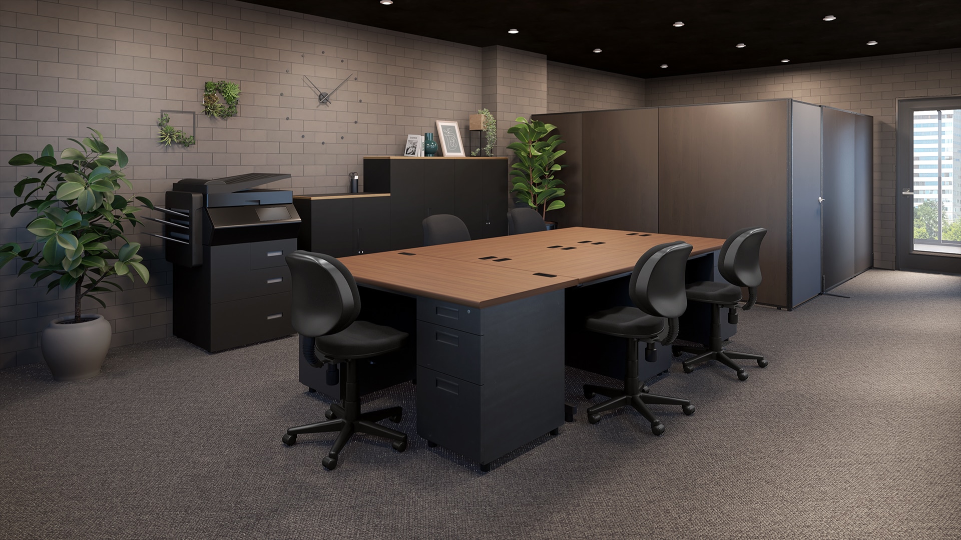 向かい合わせの5人用ワークスペースワークスペースは、木目調天板のスチールデスクを対面式に配置した島型のデスクレイアウト。コミュニケーションの取りやすさが魅力で、スピード感のある業務遂行や団結力UPを期待できる、小規模オフィスで取り入れやすいレイアウトです。ウォルナットデスクにブラックのデスクチェアを合わせることにより、シックで洗練されたワークスペースを演出。また、カギ付きキャビネットを備えた片袖机を採用しており、私物の管理も安心です。