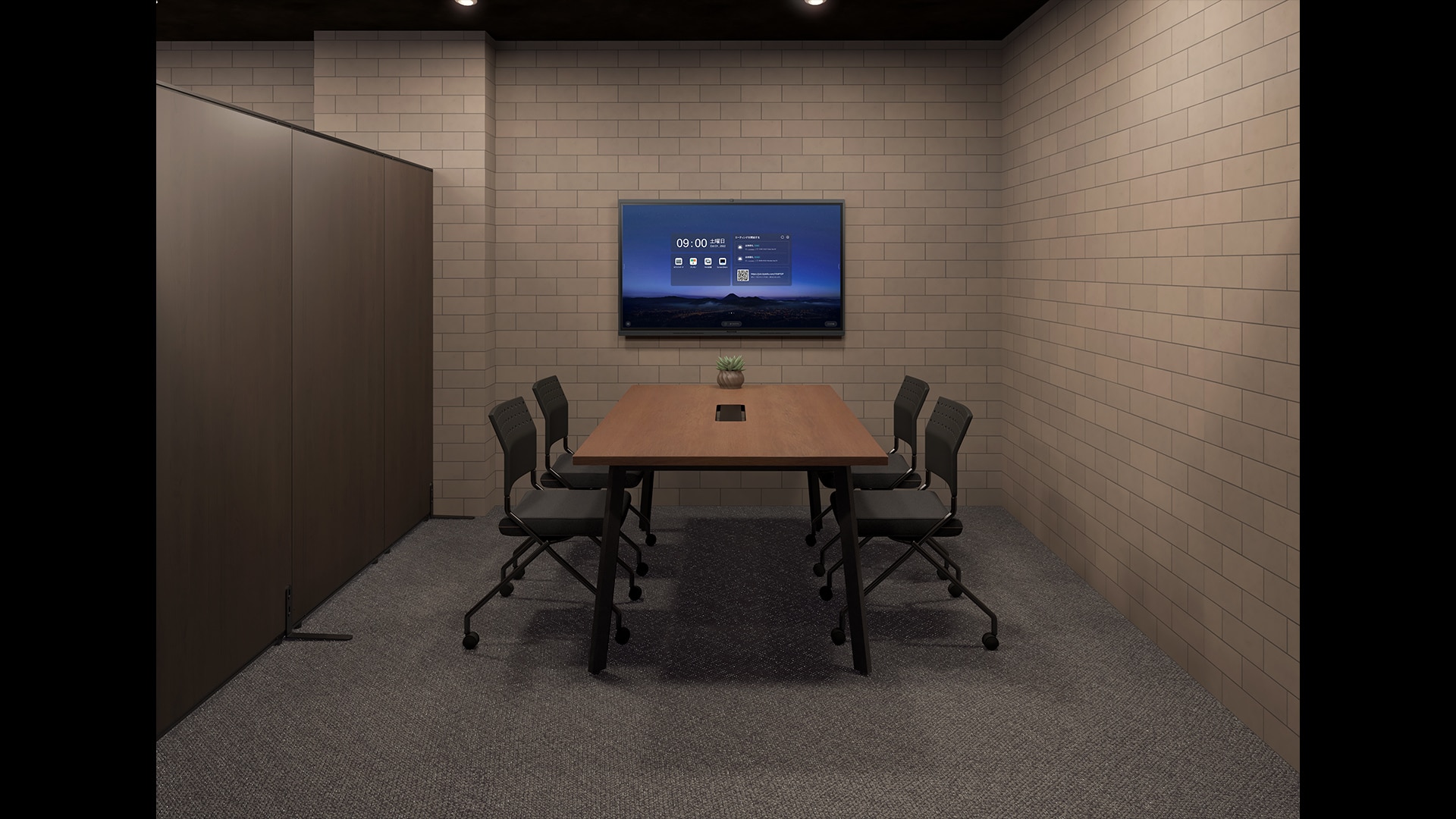 ダークトーンのおしゃれなミーティングスペース小規模なオフィスで小部屋が増やせない場合でも、パーテーションで区切るだけで手軽にミーティングスペースを設置できます。おしゃれなレンガ調の壁とシンプルでスッキリとしたミーティング家具を組み合わせることで、集中して会議に臨める空間作りを実現。また、会議や商談が無い時はリフレッシュスペースとしても活用できる合理的な設計で、パーテーションでプライバシーを確保できるため、人目を気にせずリフレッシュできます。 ▶高性能のコミュニケーションボード「MAXHUB」はこちら