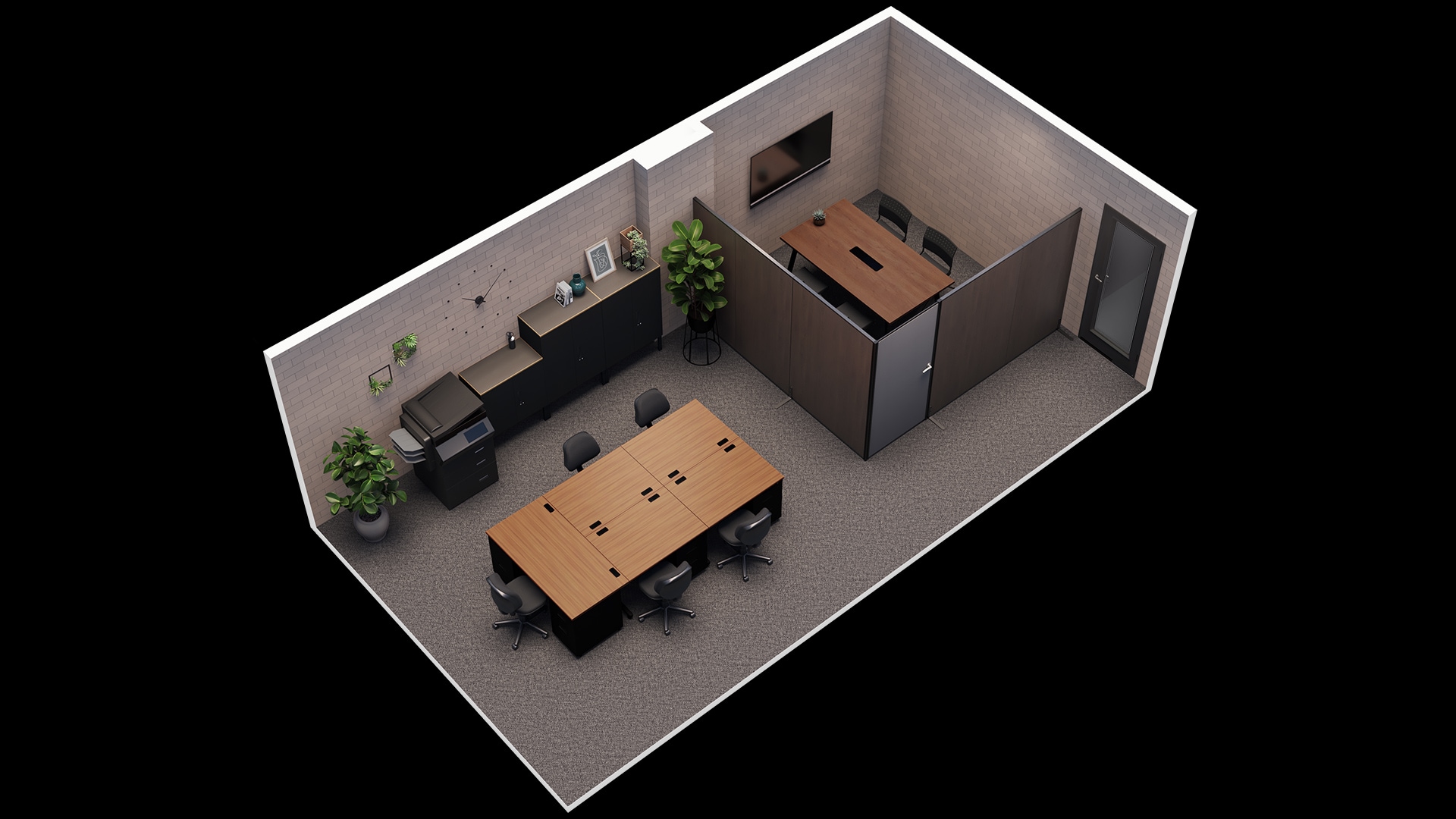 シックでおしゃれなオフィスレイアウトダークカラーの家具を中心に、木目調素材で温もりを加えたバランスのよい空間デザイン。簡易パーテーションの活用によりミーティングスペースまで備えられた、小規模ながら実用性にも優れたオフィスレイアウトです。家具は最低限におさえて通路幅を十分に確保することで、ストレスなく快適に過ごせる空間に。さらに、デスクに収まるコンパクトなチェアを選ぶと、狭い事務所もスッキリ。また、ミーティングスペースを出入口近くに配置することで、スムーズに来客案内できる動線を整えました。