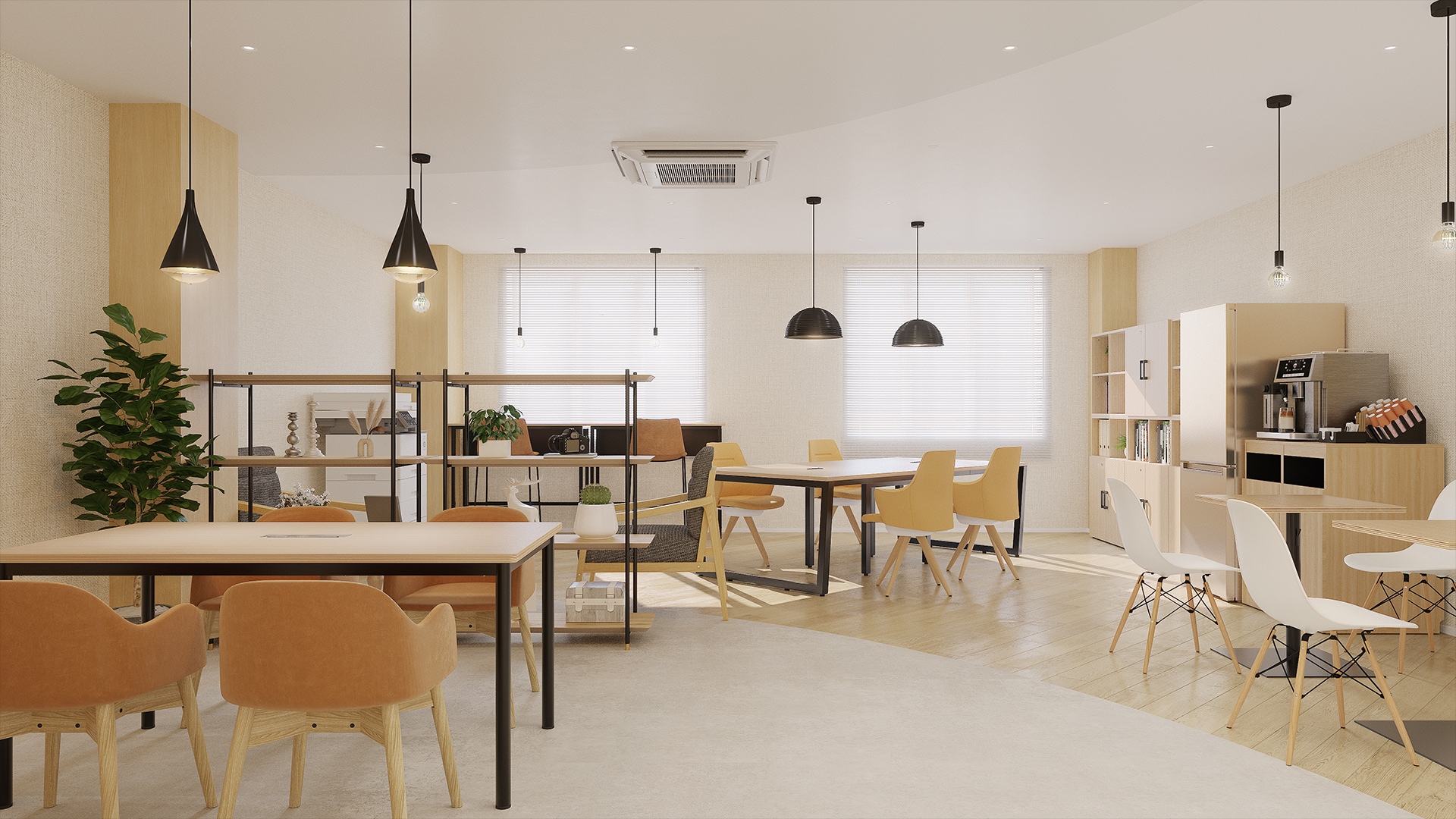 人が集まり会話が生まれるオフィス空間緩やかなカーブを描く床材の貼り分けが、空間に柔らかな動きと自然なつながりを生み、人の流れをスムーズに誘導します。視覚的にも心地よく、空間全体にやわらかさと開放感を与えるデザインです。奥の窓際には自然光が差し込む集中スペースを、中央にはフリーアドレスデスクを配置し、個人作業からチーム作業まで幅広く対応できます。木の温もりやグリーン、ブラックアイアンをバランス良く取り入れたナチュラルモダンな空間は、働く人の集中力や快適さを高め、自然なコミュニケーションと活気も生み出します。 ▶実績豊富! オフィスコムの内装工事についてはこちら ▶実績豊富! オフィスコムの電気・照明工事についてはこちら