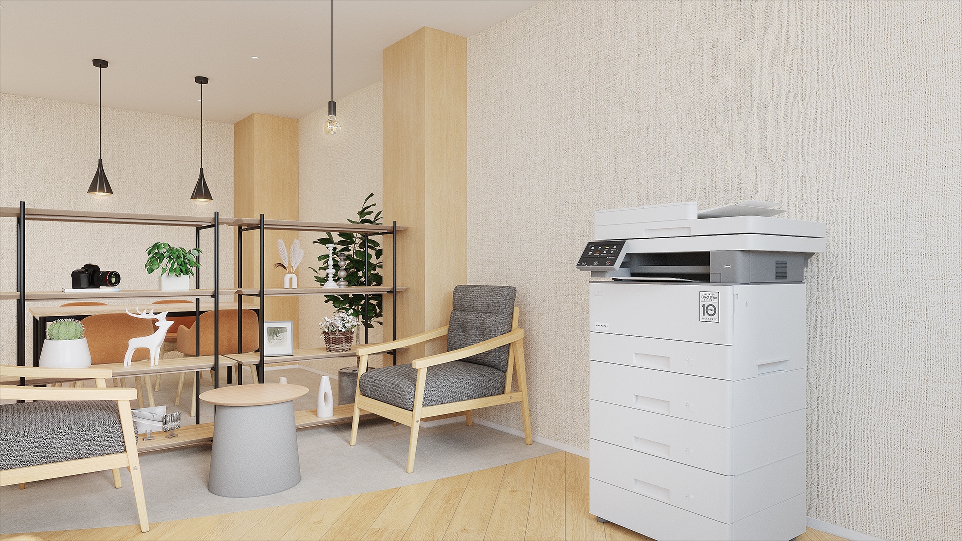 毎日通うオフィスが「お気に入りのカフェ」のように心地よければ、働く時間そのものが心地よく変わるはずです。わざわざ出社するからこそ、オフィスには「集まる価値」と「働きたくなる心地よさ」が必要です。ただ作業を行うだけの無機質な空間では、集中力や創造性が続かず、社員のモチベーションやコミュニケーション低下にもつながりかねません。そこでご提案するのが、木の温もりやグリーンの柔らかさ、アイアンのスタイリッシュさが融合したカフェスタイルのオフィスです。落ち着いた雰囲気の中でリラックスしながらも、自然と集中できる環境が、気軽な会話やアイデア共有を促し、チームの活性化や組織の創造性を高めます。働く人が「この場所で働きたい」と思えるオフィスこそが、企業の価値や生産性を支える新しい時代の職場のかたちです。空間が変われば、働き方も、人の気持ちも、そして企業の未来も、きっと変わっていきます。
