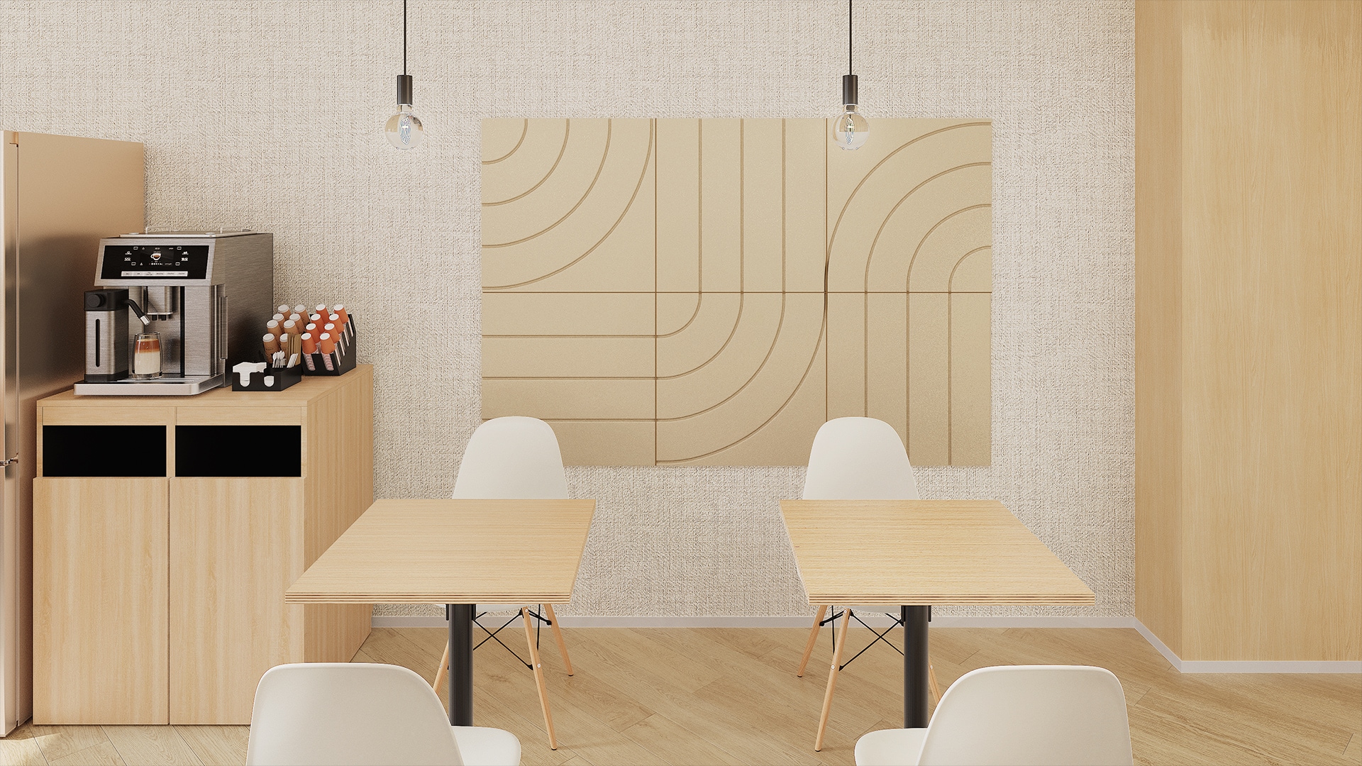多様な働き方を支えるリフレッシュ空間ちょっとしたコーヒーブレイクやランチ、気軽な打ち合わせや個別作業まで、さまざまなシーンで活躍するリフレッシュスペースです。背面の壁には吸音パネルを設置し、会話の音が周囲に広がるのを防ぐことで、周囲に気兼ねなくリラックスしながら過ごせる環境をつくりました。静けさと心地よさを両立したデザインは、働く人の気持ちをほぐし、自然なコミュニケーションも促します。適度な距離感とやわらかな雰囲気が、集中とリラックスの切り替えをサポートし、快適な働き方を支える空間となっています。