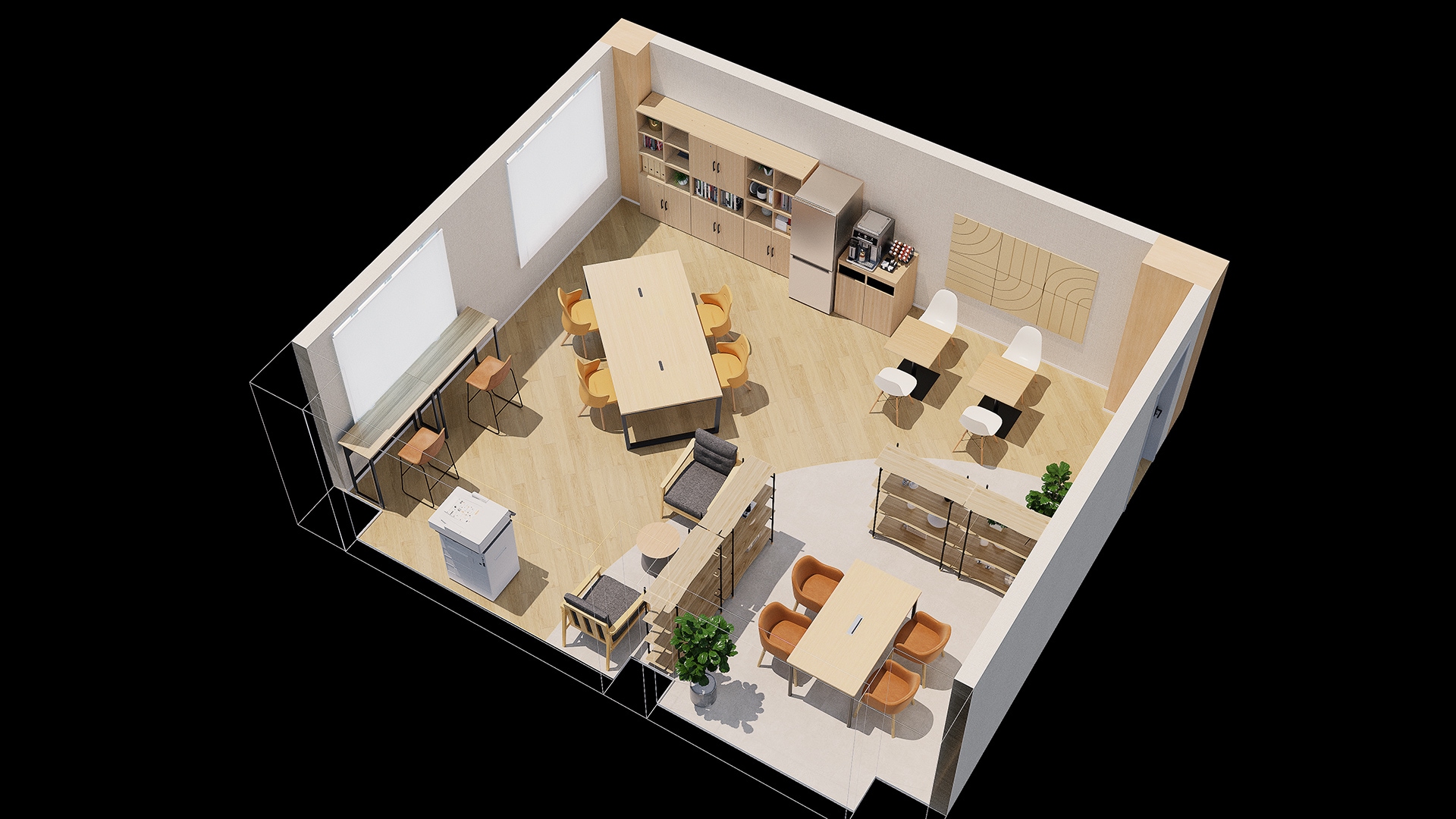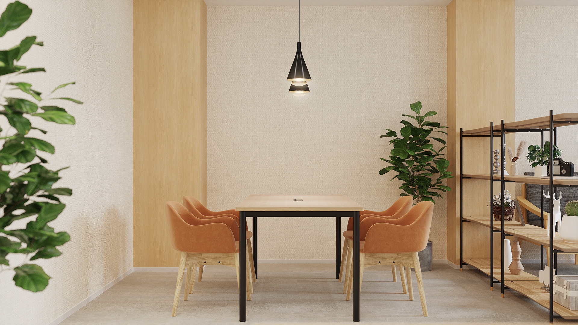 心地よく落ち着いた会議スペースお客様との商談や社内ミーティングなど、幅広いシーンで活用できる4人掛けの会議スペースです。周囲には、空間をゆるやかに区切り収納も兼ねたシェルフを設置し、適度なプライベート感と開放感を両立しています。落ち着いた色合いや木の温もりが、安心して会話できる雰囲気を生み出し、自然なコミュニケーションを促します。シンプルで統一感のあるデザインが集中しやすい環境をつくり、働く人やお客様にとって快適な空間です。日常の打ち合わせから商談まで、ビジネスシーンを支える上品な会議スペースです。