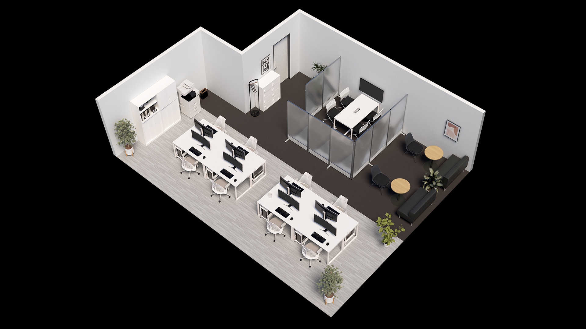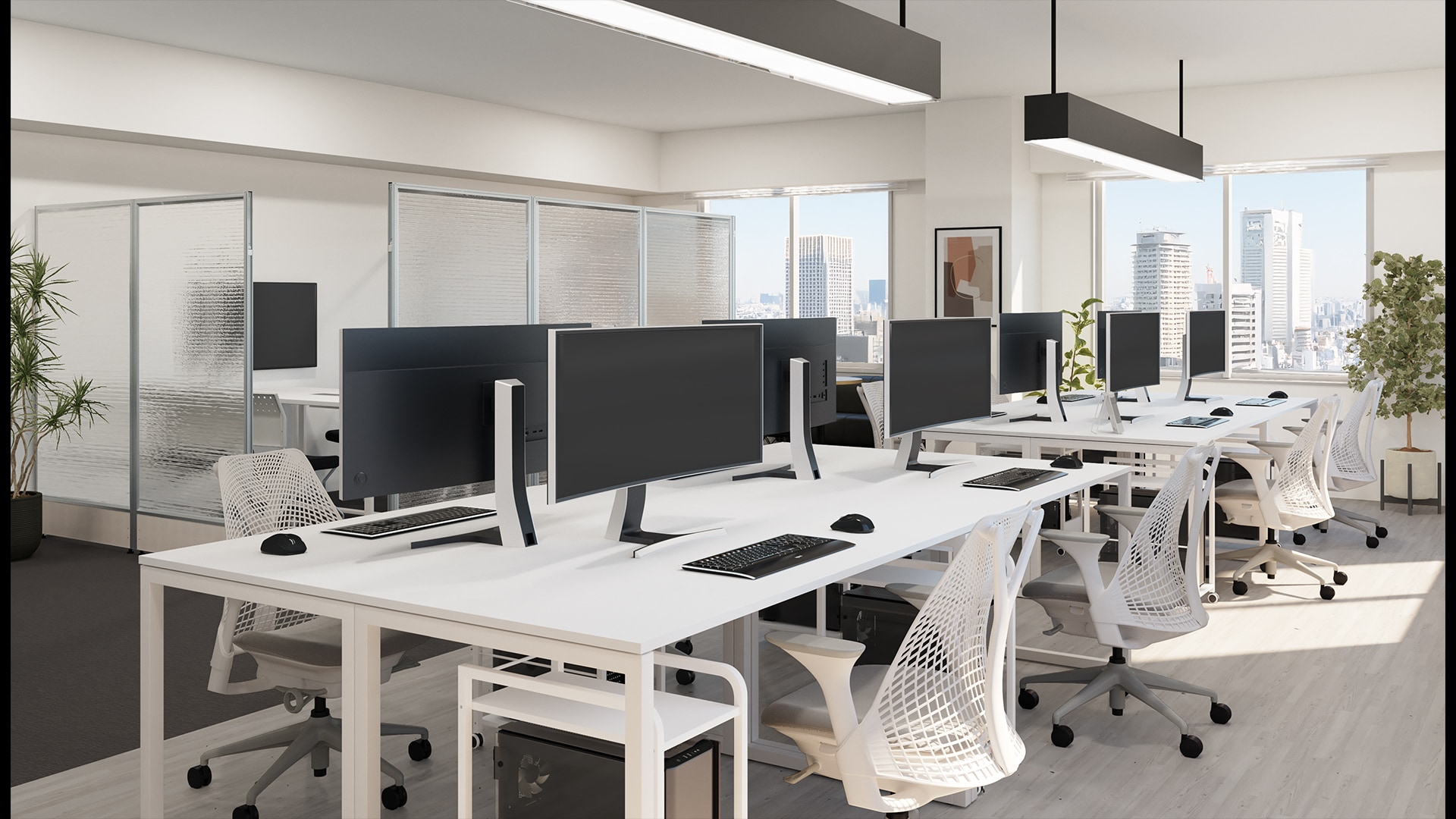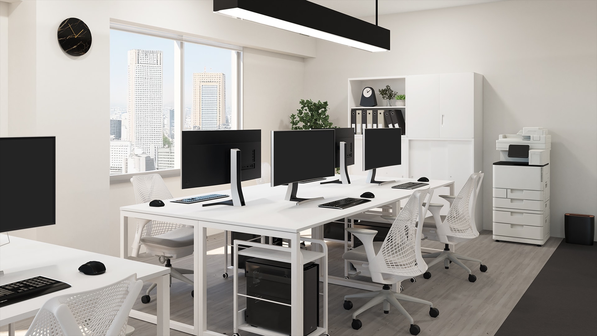 8人用の快適なワークスペースレイアウトモノトーンにデザインした機能的でありながら洗練された雰囲気のワークスペース。島型に4台ずつ配置した広々としたデスクの下にはCPUワゴンを設けることで快適な作業環境を提供。デスクの軽快なフレーム脚やセイルチェアのモダンなフォルムはシンプルな空間のアクセントとなり全体のデザイン性を高めます。さらに、窓から差し込む自然光や観葉植物のグリーンがオフィス全体にリラックス感をプラス。私物や書類を効率よく管理できる充実した収納家具もポイントで、シンプルながらも居心地のよい空間です。