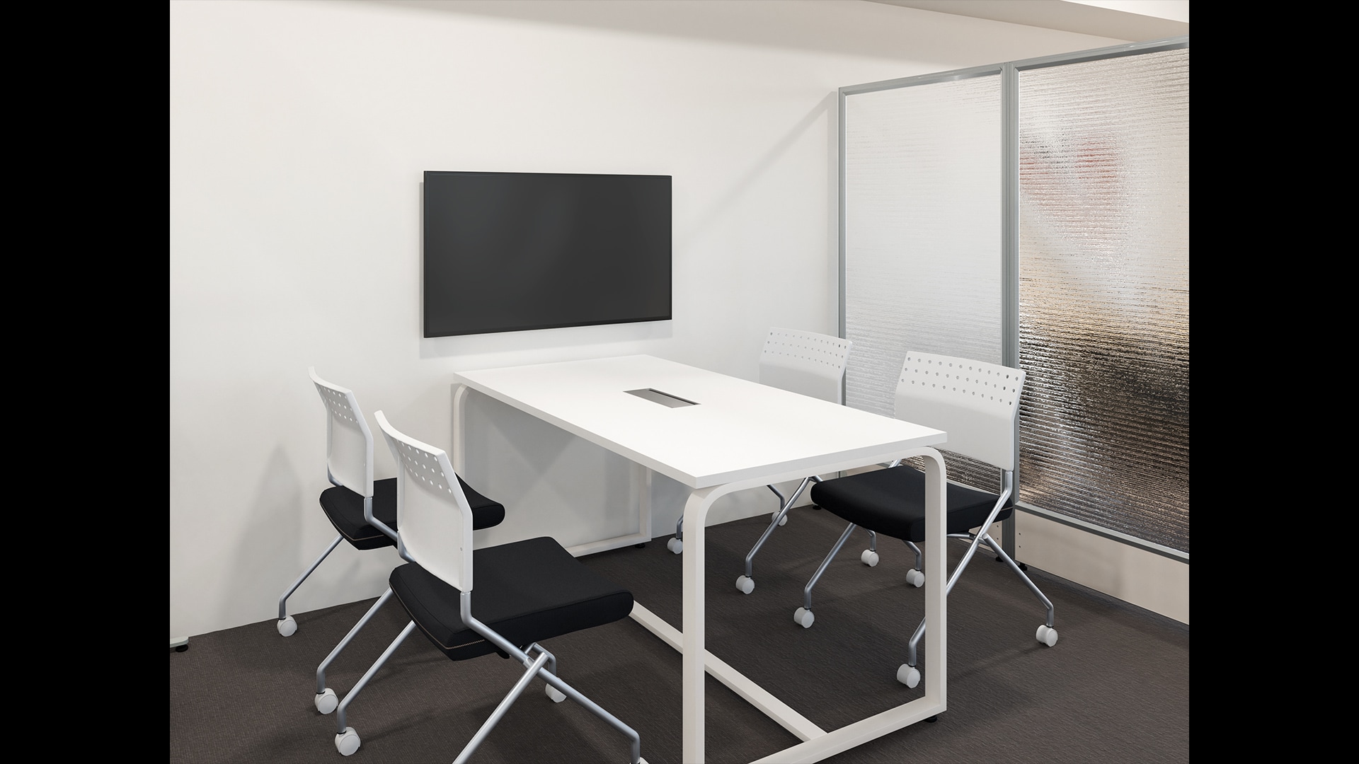 シンプルでおしゃれなミーティングスペースミーティングスペースも白と黒を基調にまとめ、視覚的なノイズを抑えてシンプルにデザイン。半透明のローパーテーションで仕切ることにより、周囲の視線は遮りつつも光は通す落ち着いた空間に。余計な装飾がなくモノトーンで統一された環境は集中力を高めるため、会議やブレストにおすすめのデザインです。入口付近に配置しているため応接用にも使える汎用性の高さも魅力。ローパーテーションは工事が不要なのでコスパよく空間を区切れるだけでなく、移動させることで状況に応じたレイアウト変更も可能です。