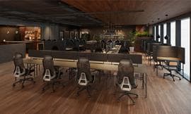 チームの結束を高める島型ワークスペースワークスペースは、4人×2列の島型レイアウトで構成。チーム内の連携を図りやすい配置でありながら、各席の間にはゆとりがある適度な距離感が魅力。コミュニケーションが活発な業種やプロジェクト単位の作業におすすめです。チェアには、通気性とデザイン性に優れた高機能メッシュチェア「AE-1」を採用。姿勢サポート機能が充実しており、快適な座り心地を提供します。味わいある古木調デスクとブラックチェアの組み合わせにより、ナチュラルで引き締まった印象の空間に仕上げています。