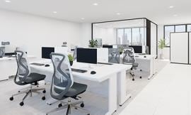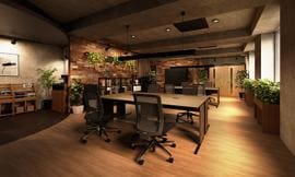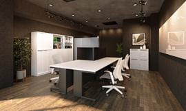 本記事では、ホワイト、ダークグレー、ブラックといったモノトーンを基調とした、洗練されたデザインが特徴の8人用小規模オフィスレイアウトをご紹介。20~30坪のコンパクトなスペースには、実用性を考慮したミーティングルームとおしゃれなエントランスも組み込まれています。使用するオフィス家具にはシンプルでスタイリッシュなものをセレクトすることで、空間全体が整然とした印象に。オフィス全体がスッキリとまとまっていることで、社員や来訪者に信頼感を与える効果が期待できます。また、窓から射し込む自然光とオフィスグリーンを活かすことでナチュラルさが加わり、無機質な印象が和らぐリラックス空間を実現しました。
