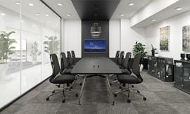 調光ガラス張りのおしゃれミーティングルームミーティングルームは、高級感のあるミーティングテーブルとレザーチェアを使用することで、ハイエンドな雰囲気に仕上げました。また、仕切りには防音性に優れたガラスパーテーションを採用しており、適度な緊張感のなかで集中して会議に臨めます。「瞬間調光機能」付きの特殊ガラスなので、開放感のある透明ガラスと、プライバシーを確保できるスモークガラスを瞬時に切り替え可能。状況に合わせた環境づくりをワンタッチで実現できます。