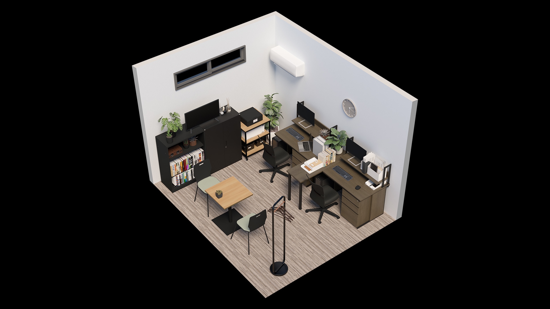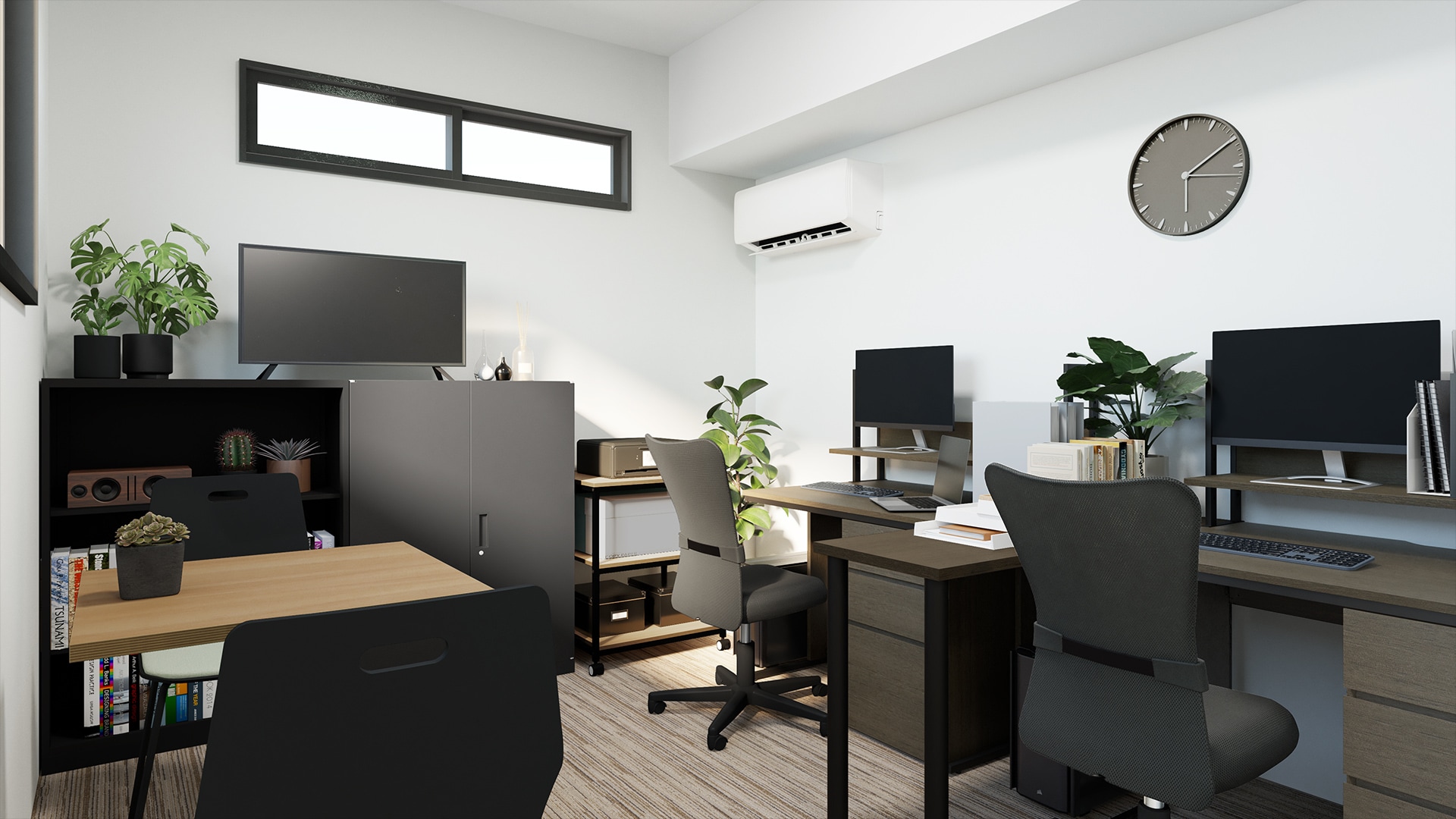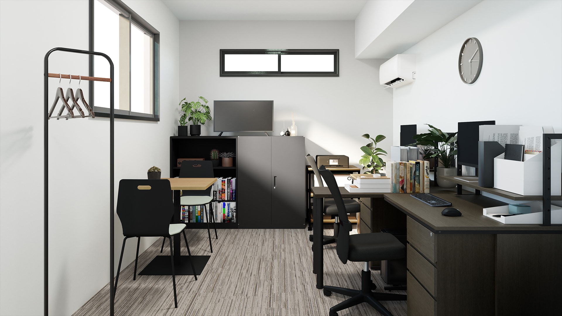 コンパクトで機能的な小規模オフィスレイアウト今回の事例は、全ての家具を約20万円で揃えたリーズナブルな2人用の小規模オフィスレイアウトです。狭いオフィスでは、限られたスペースの使い方と家具の選び方が空間のデザイン性&作業効率を左右する重要なポイント。デスク上下の空きスペースを収納エリアとして活用したり、サイドテーブルを活用して机上スペースを増やすなど、レイアウトの工夫次第で通路や作業スペースを広々と確保できます。また、カギ付きの書庫も設置しているので私物管理も安心な快適に過ごせるオフィスです。