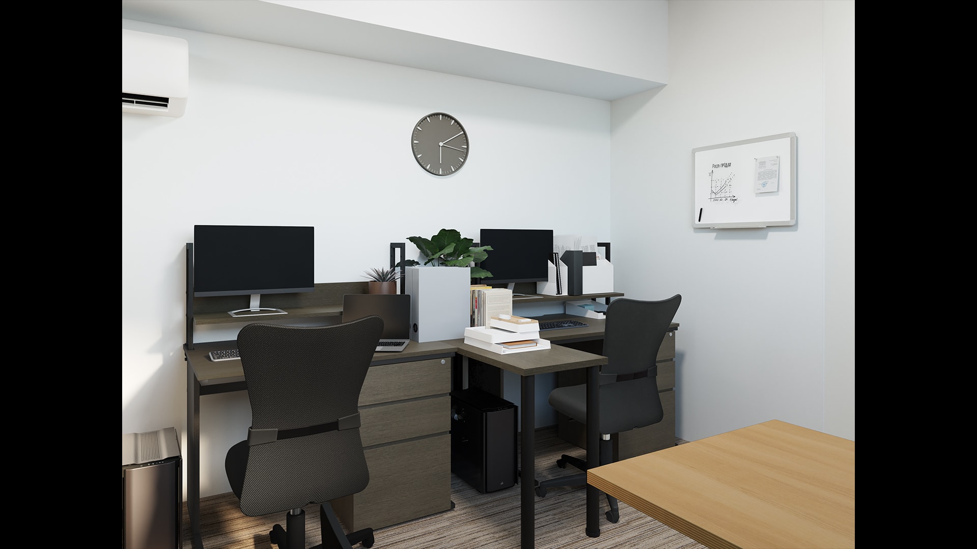 空きスペースを効率的に活用した2人用ワークスペースワークスペースのデスクは壁付けして横並びに配置。視界に余計なものが入らないので作業に集中しやすいだけでなく、後方にミーティングスペースや収納スペースを設けるなど、空間を有効活用することが可能です。また、袖机、サイドテーブル、机上ラックを取り入れてデスク周りの収納を充実させたり、壁面のスペースを活かせる壁掛けホワイトボードを活用したりすることでコンパクトでも機能的な作業空間に。サイドテーブルは、机上スペースの拡張だけでなく、隣席との仕切りにもなり作業に没頭できます。