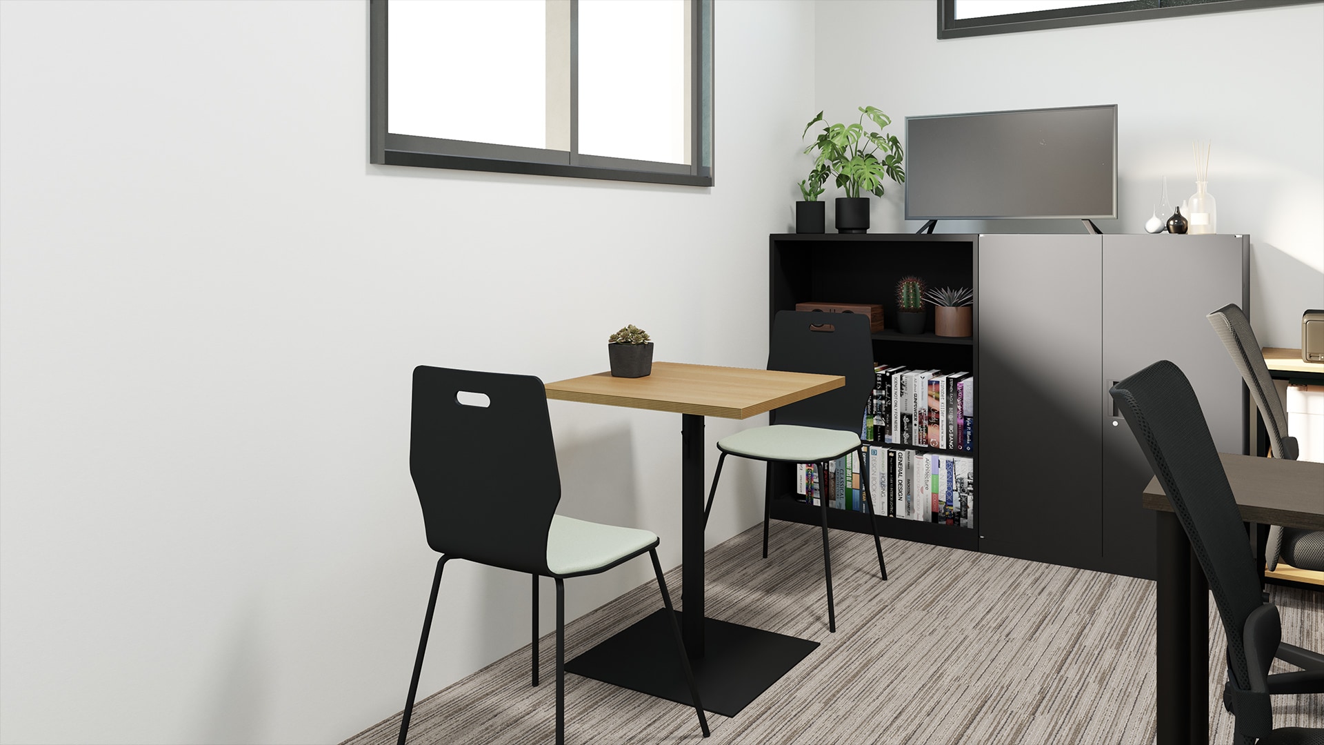 コンパクトで実用的なミーティングスペースワークデスクの後方には、約6畳のオフィスにも導入できるコンパクトでおしゃれなミーティングスペースを設置。軽量で移動しやすい家具をミーティング用にセレクトしており、チェアはスタッキング可能なので使用しないときはよりコンパクトにまとめて保管できます。チェアとテーブルともに脚部がすっきりとしたデザインで揃えているのもポイント。足元が広々としていることにより快適に座ることができ、休憩や来客対応にも活用できます。