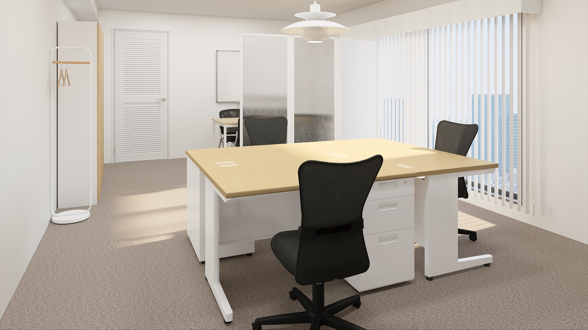 低予算オフィスレイアウト全ての家具を約30万円で取り揃えた、リーズナブルなオフィス。ナチュラルカラーで揃えると、限られた家具でも統一感のある明るい空間を作れます。デスク・書庫・コートハンガー・ホワイトボードなどの家具はコンパクトなタイプをセレクトし、収納スペースを活かして整理することでスッキリとした印象のオフィスに。入り口付近にはパーテーションで区切られた会議スペースが備わった、低コストながらも働きやすい設計です。