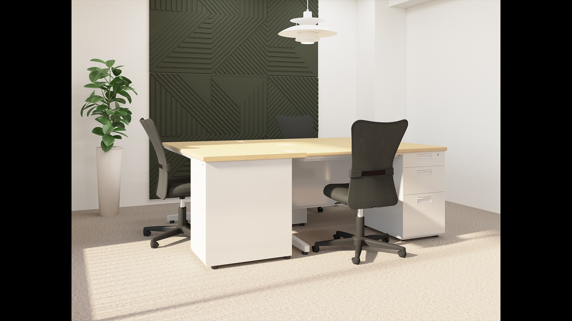 島型のワークスペース社員同士の連携やスピード感のある業務遂行が重要なスタートアップ企業では、デスクを向かい合わせに配置した島型レイアウトがオススメ。密にコミュニケーションを図れるため、効率よく業務を進めることができ、チームとしての団結力も高まります。カギ付き収納を備えた片袖机であれば、別途ロッカーを用意する必要がなく、手元で私物を施錠管理できるので安心です。