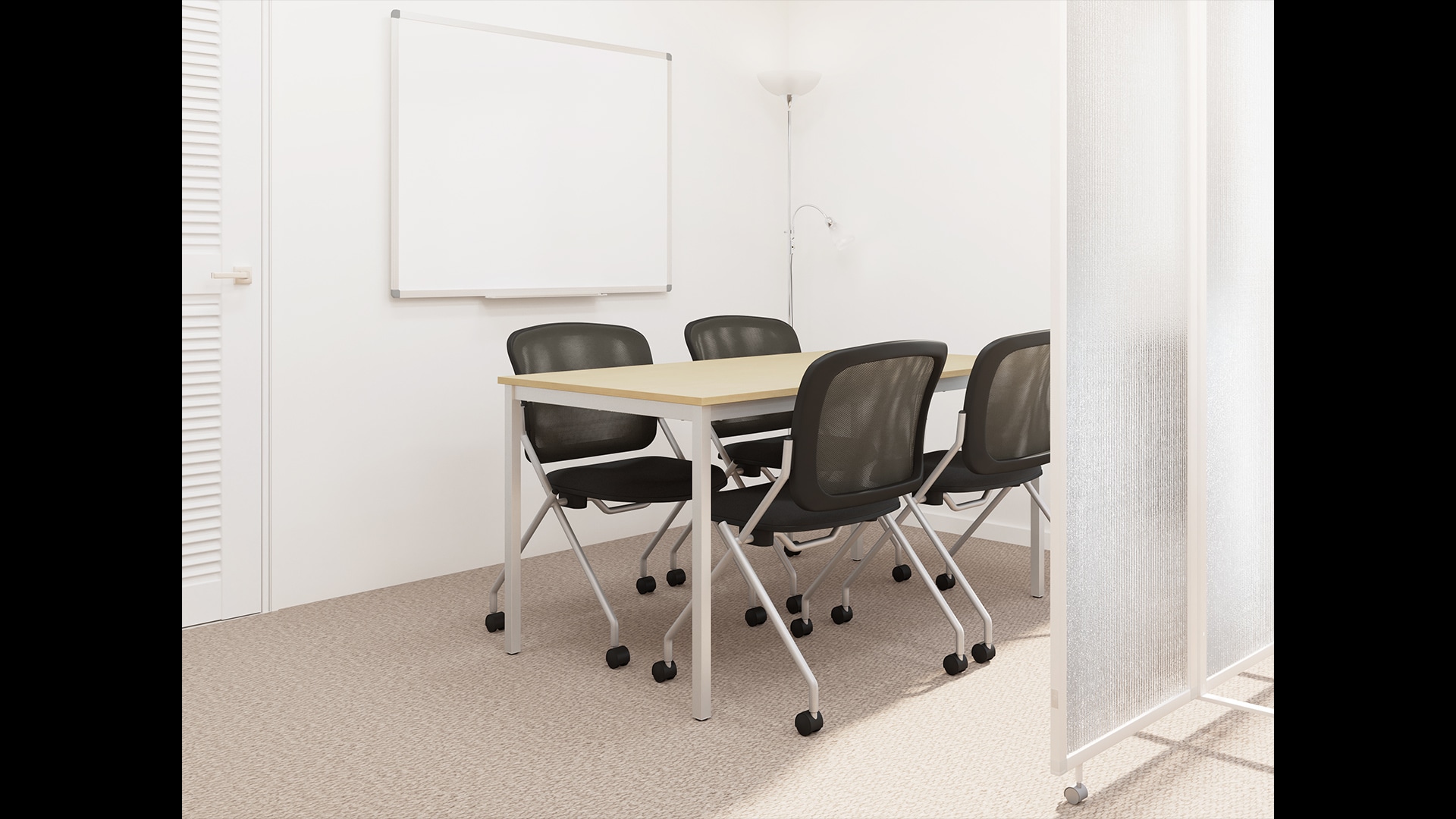 視線を遮るミーティングスペース6坪程度の小規模オフィスの場合も、パーテーションを活用することで簡単に会議用スペースを作れます。光が差し込む半透明タイプを選べば、空間を明るく広々と見せつつ、執務エリアからの視線を気にせずに会議できる環境に。また、壁付けタイプのホワイトボードを採用すると、壁の空いたスペースを有効活用できるだけでなく、打ち合わせの質も高まります。