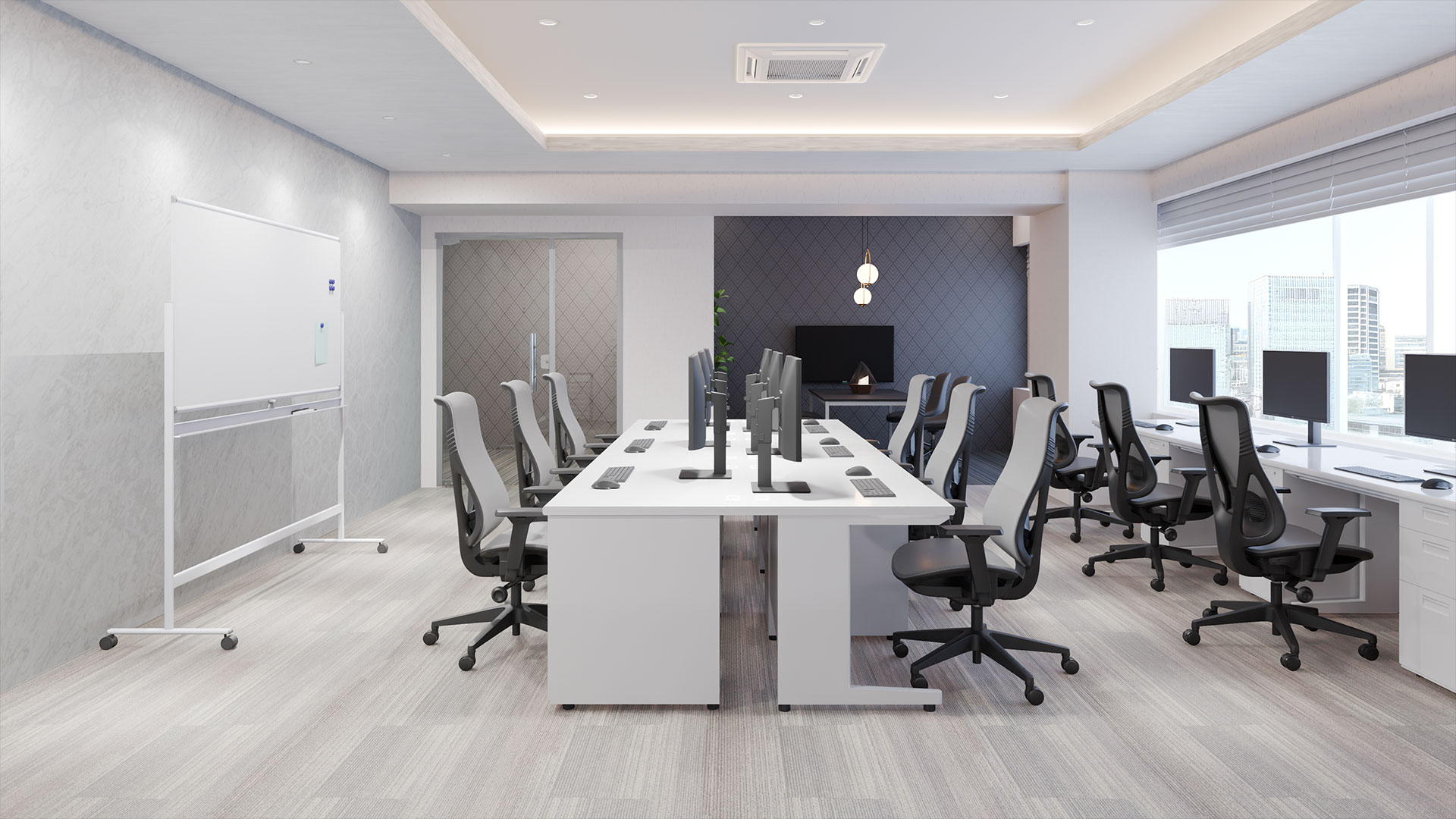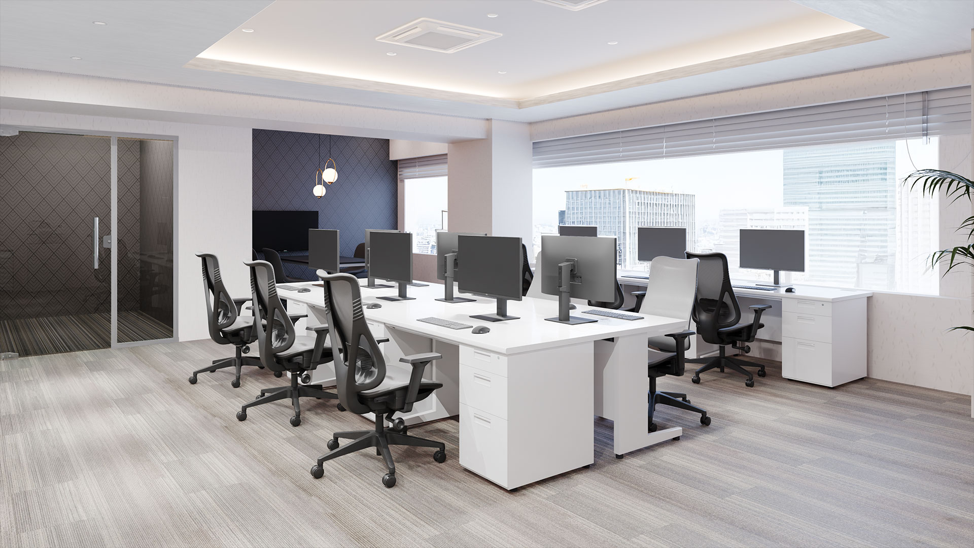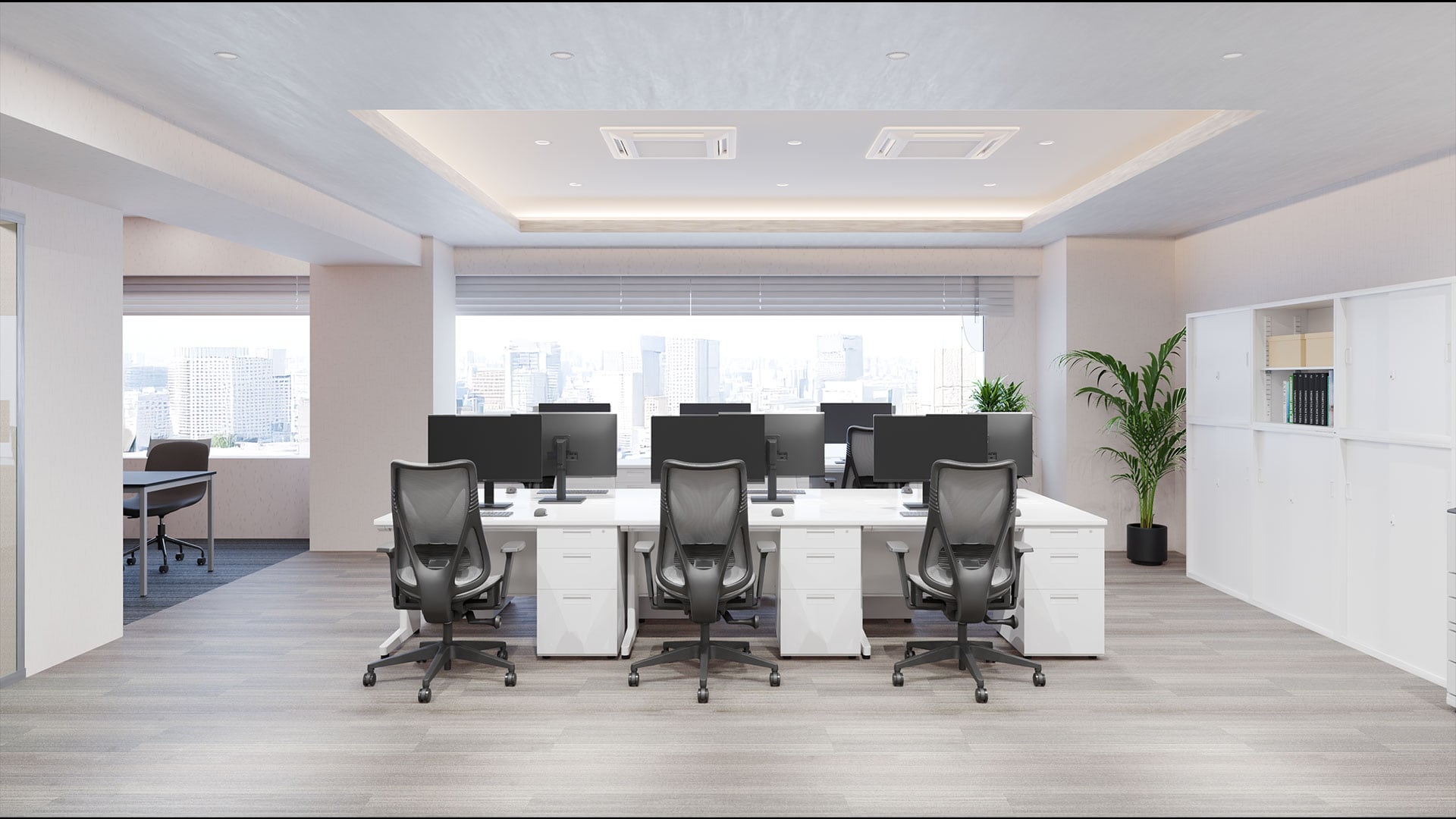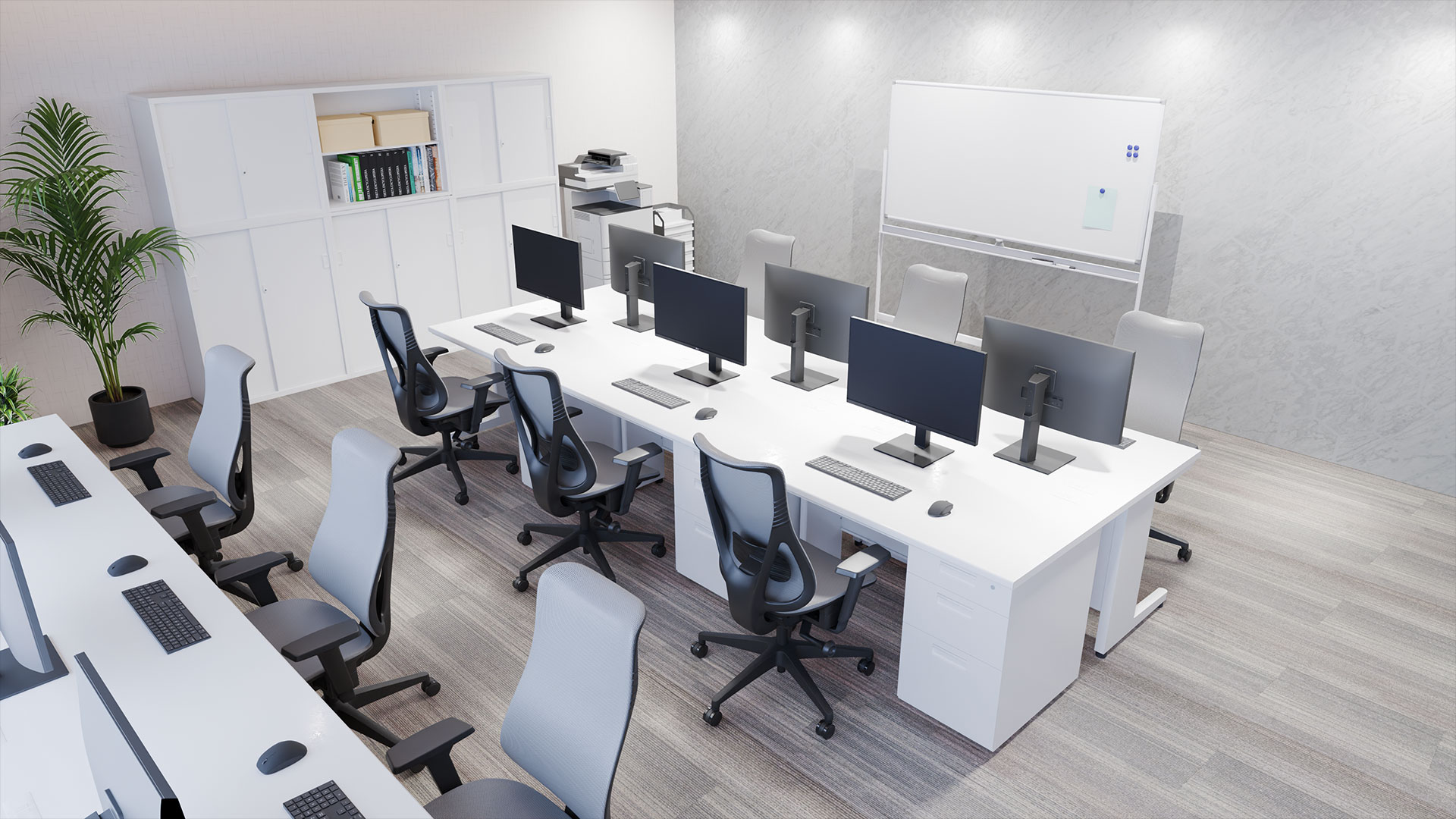 快適な9人用ワークスペース白を基調としたワークスペースは、明るく清潔感のある雰囲気が魅力。整然と並ぶデスクが視界をすっきりと整え、窓から入る自然光を受けて一層の明るさを感じさせます。ワークデスクは会話重視の島型と集中重視の壁付けの2タイプに配置。チェアにはオールメッシュ仕様の『GR-002』を採用し、通気性とサポート力を両立。長時間の作業でも快適に過ごせる環境を実現しています。そのほか、キャビネットや複合機を壁際にまとめて設置するなど、広い動線にも配慮した小規模ながらも働きやすいおすすめ設計です。
