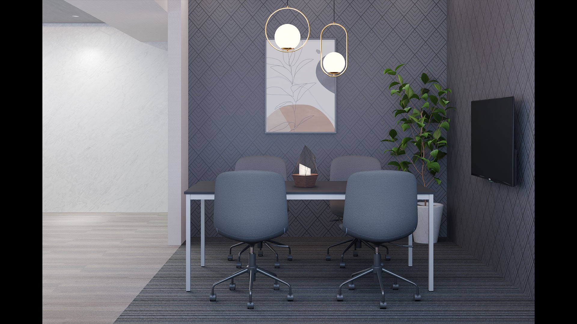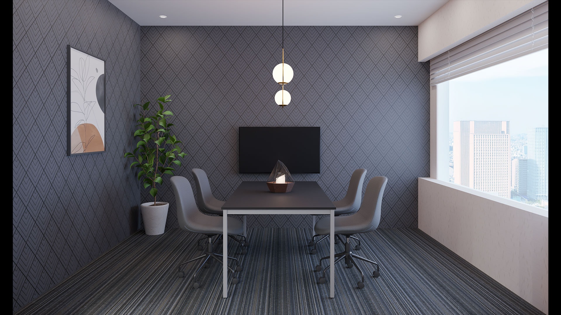 4人用ミーティングスペースワークスペースの脇には、必要な要素を押さえつつシンプルにまとめた実用的な4人用ミーティングスペースを設置。ホワイト基調のオフィスの一角をダークカラーの家具や内装で引き締めることで、全体の印象をぐっとモダンに。照明には柔らかい光を放つペンダントライトを採用し、来客対応やチーム打ち合わせ時にも落ち着きを感じられるデザインに仕上げました。壁面モニターを設置することでオンライン会議にも対応できる、低コストながらも上質で機能的な空間です。