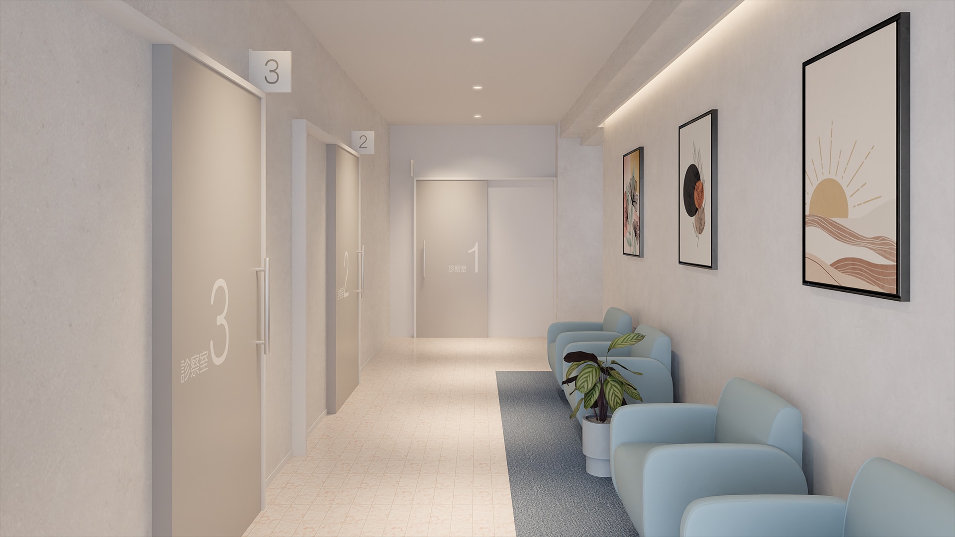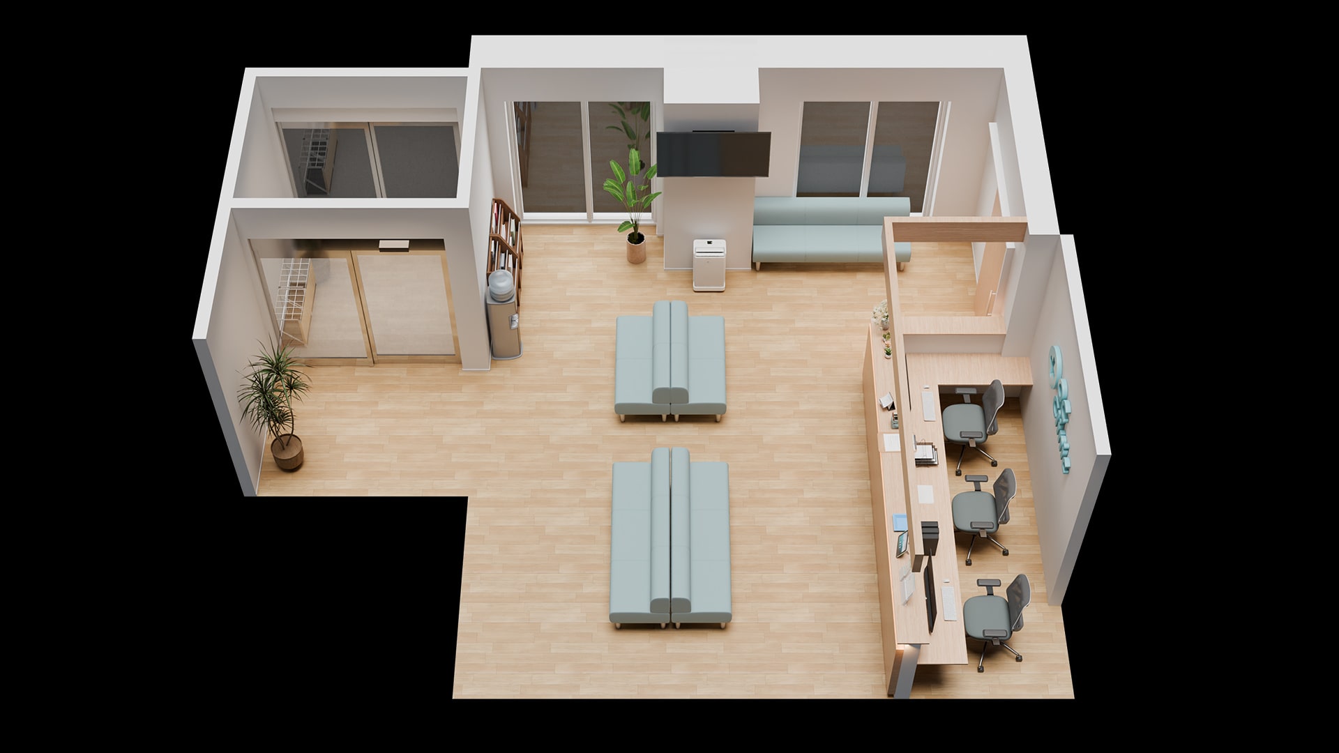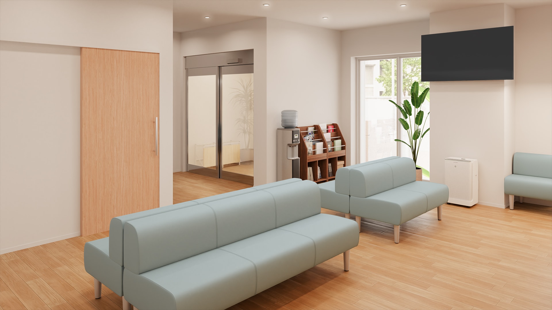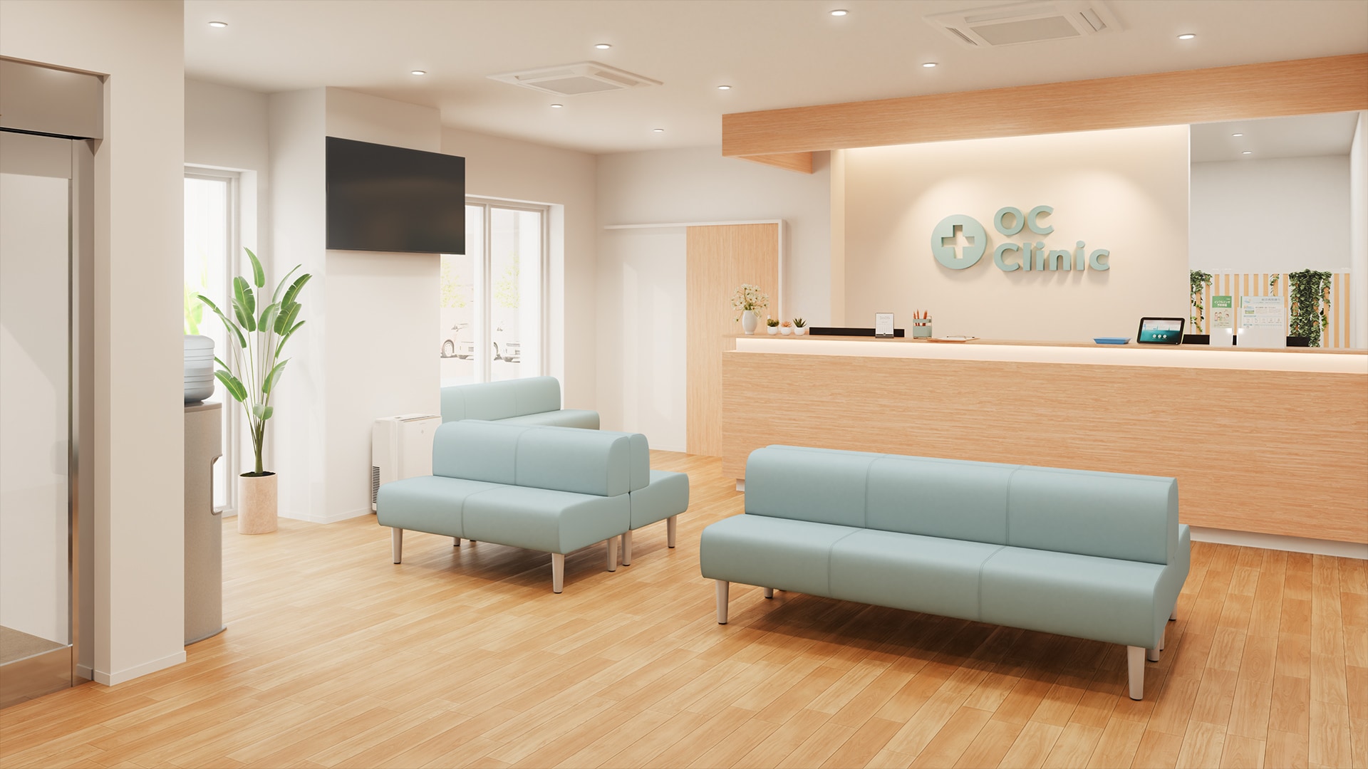 小規模クリニックの受付・待合空間木目調の受付カウンターと明るいフローリングを組み合わせた、やさしい印象の待合スペースです。ライトブルーの長椅子ベンチが空間のアクセントとなり、清潔感と落ち着いた雰囲気を演出。背もたれ付きで座り心地も良く、診察まで快適に過ごせます。スペース全体には窓から自然光を取り入れ、コンパクトな施設でも圧迫感のない開放的な空間に。受付カウンターから待合スペースを見渡すことができ、患者様の様子を確認しやすい設計もポイント。温かみと機能性を兼ね備えた小規模クリニック向けのデザインです。