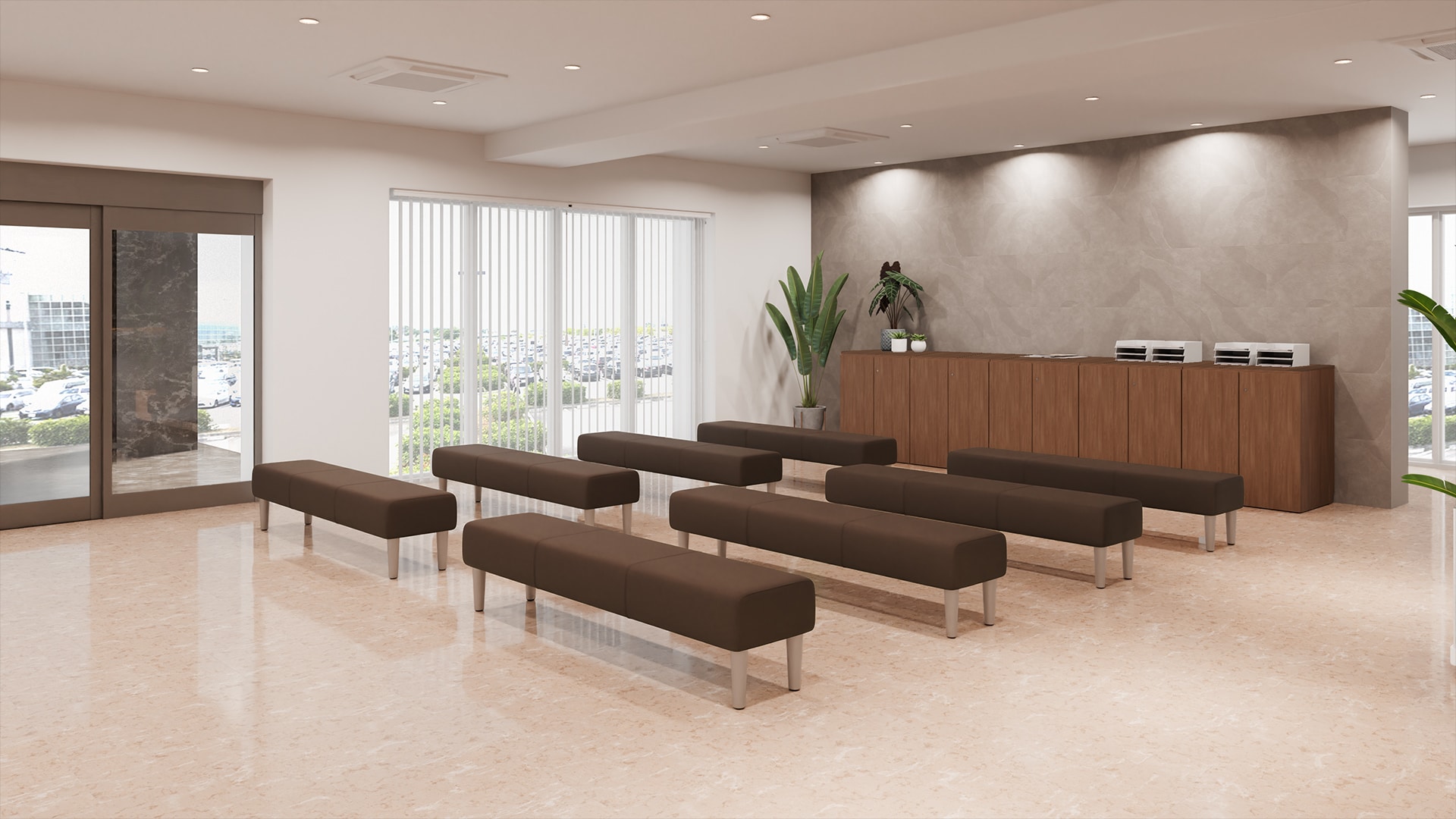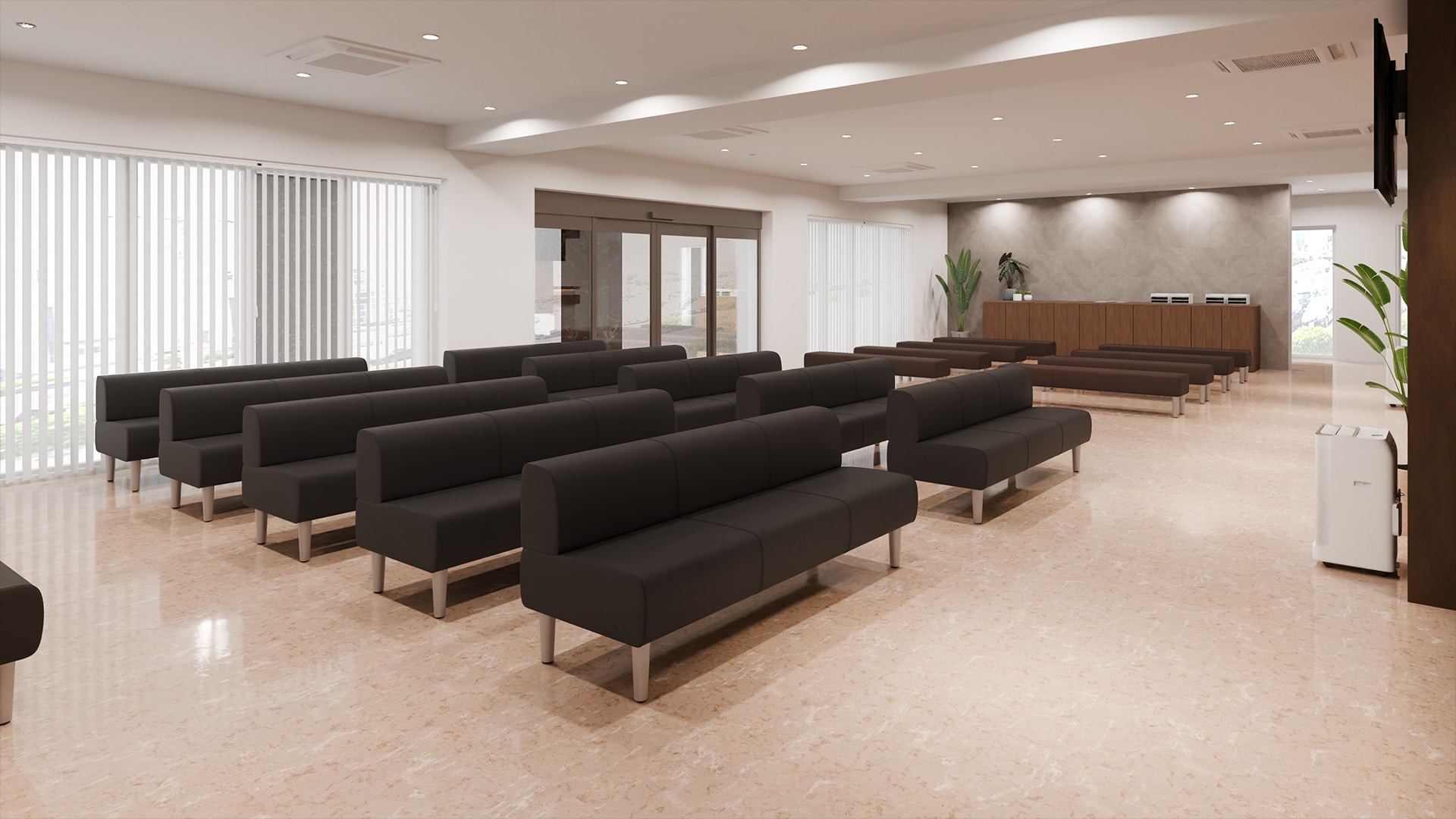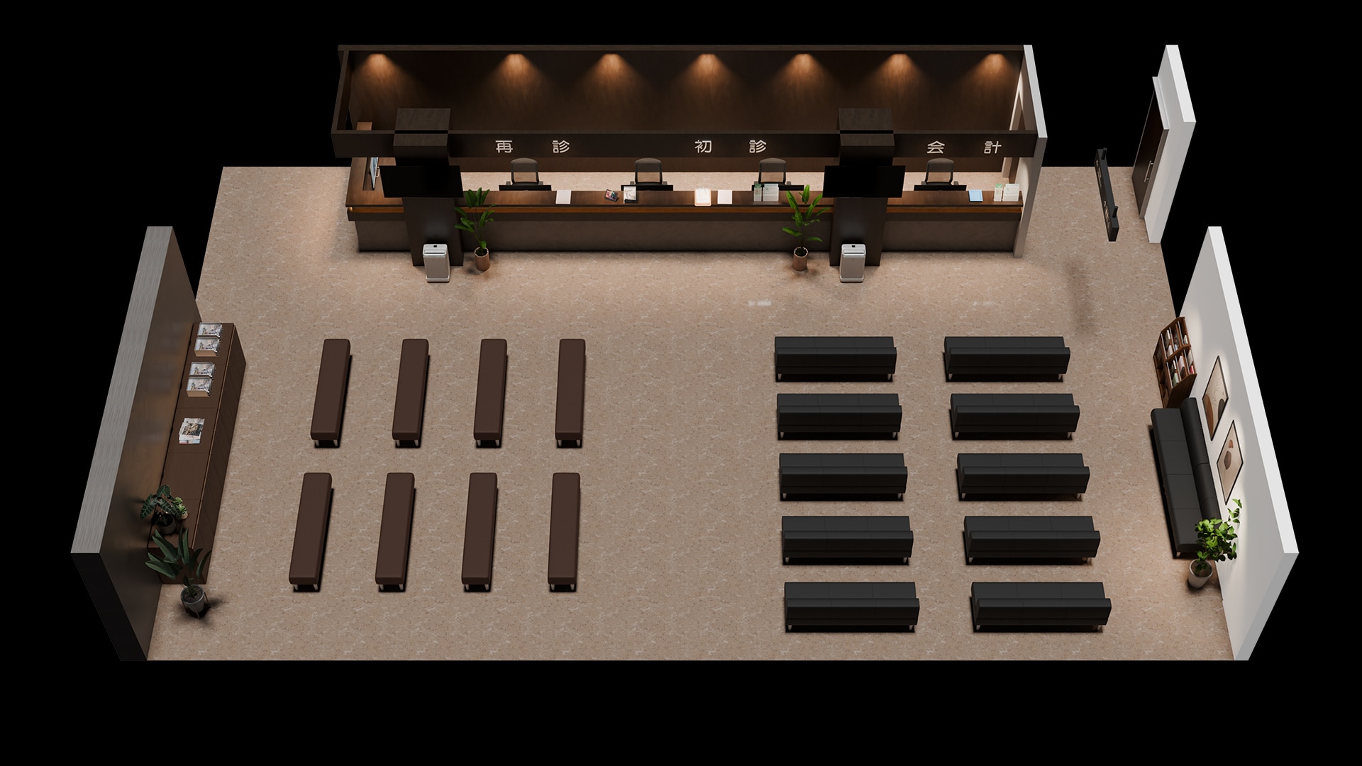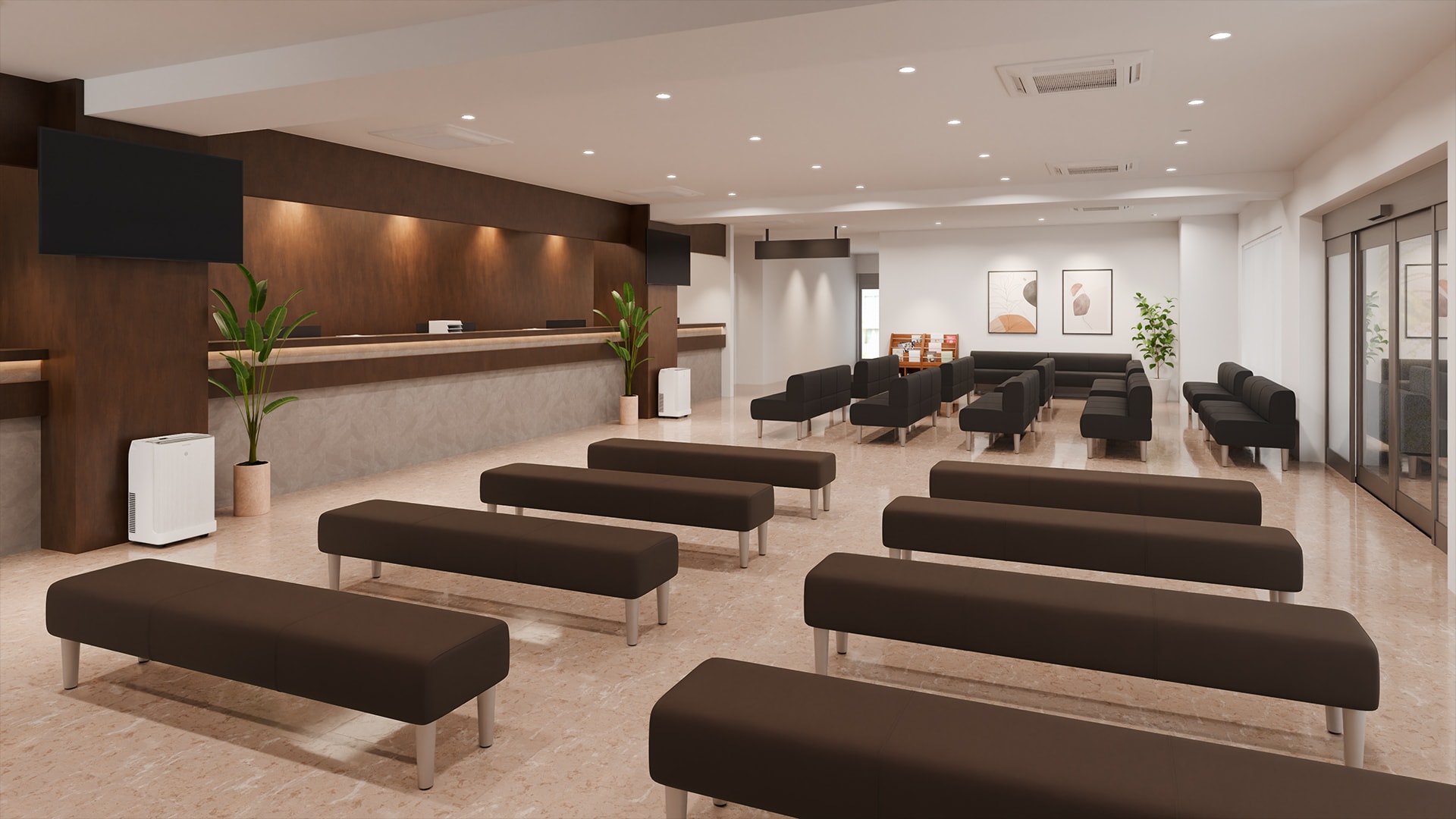 大規模病院の受付・待合空間来院者の多い医療施設では、大人数でも快適に過ごせるレイアウトが重要になります。本事例では、ダークトーンのパブリックチェアを長椅子として整然と配置することで、落ち着きのある雰囲気を演出。さらに背もたれ付きと背もたれなしのベンチを組み合わせ、状況に合わせて柔軟に選べる座席配置を実現。空間全体は、視界が抜ける工夫により混雑時でも圧迫感を感じにくい設計に。分かりやすい受付位置やゆとりある通路幅など、初めて訪れる患者様でもスムーズに移動できる、迷いにくい動線計画もポイントです。