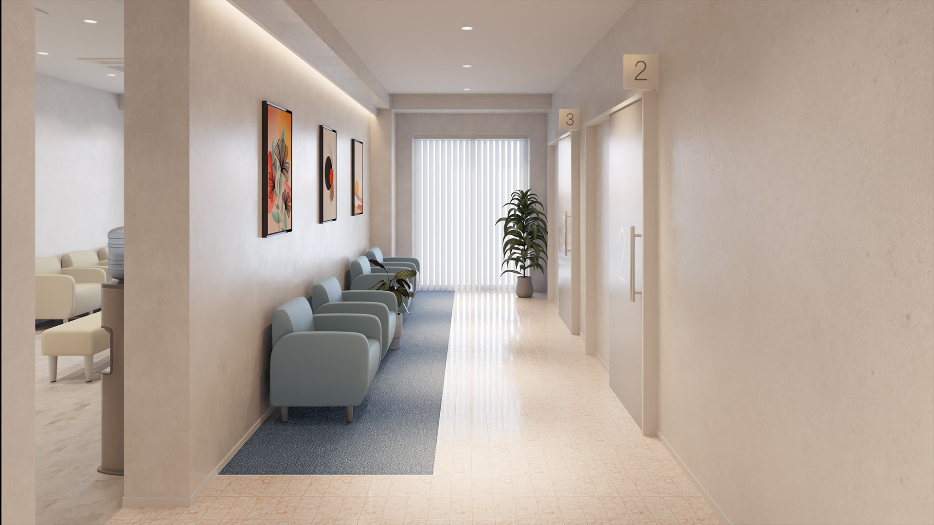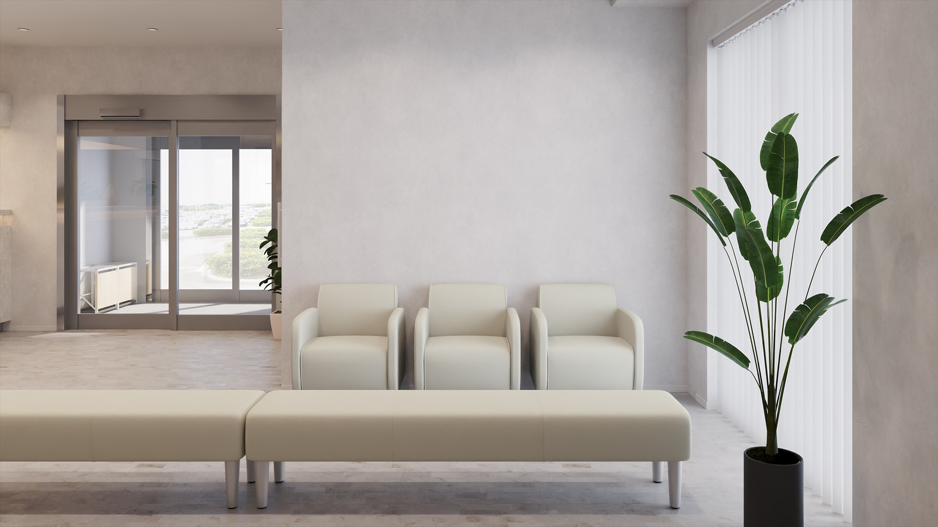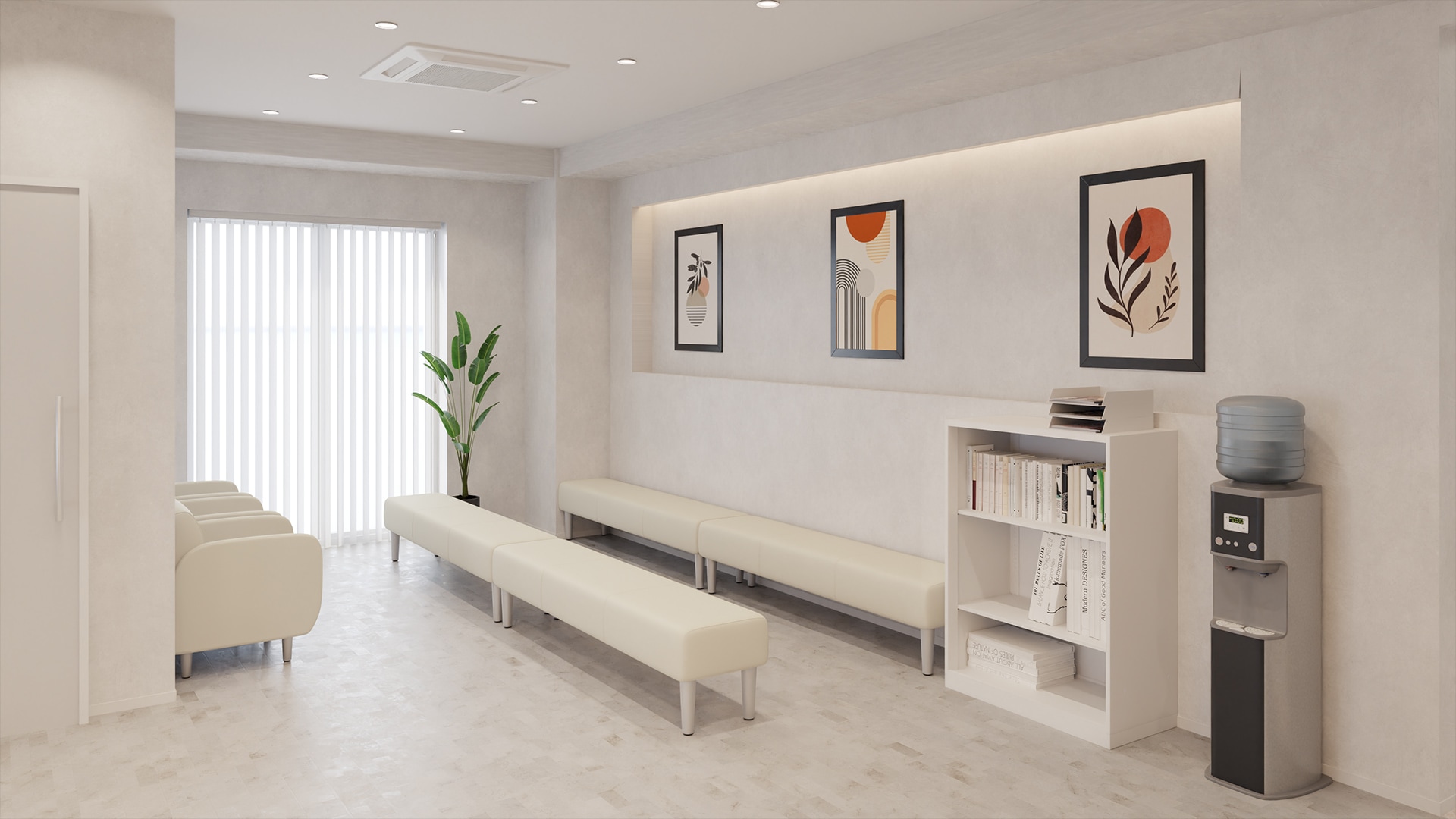 小~中規模病院の受付・待合空間直線的でシンプルな受付カウンターと、ホワイトを基調にした待合スペースが、医療施設らしい清潔感を演出。洗練された印象が魅力のレイアウトデザインです。待合室にはアイボリーの長椅子と一人掛けソファを組み合わせて配置。 2タイプの椅子を用意することで、人数やシーンに合わせて使いやすい空間に。真っ白な空間にやわらかな色を加えることで、リラックス感をプラスしています。また、通路幅にゆとりを持たせているため、混雑する時間帯でもスムーズに移動できる、配慮の行き届いた設計です。