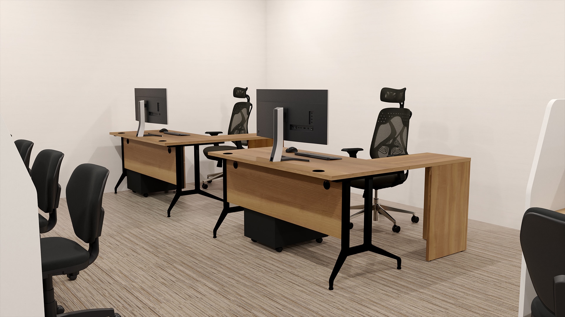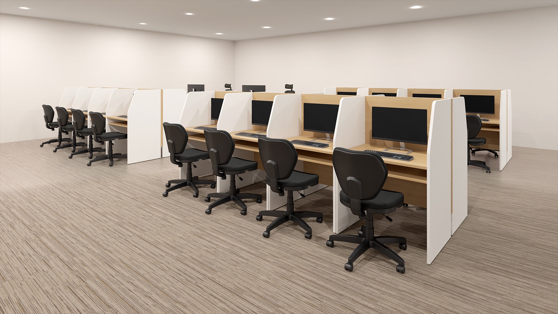 パネルデスクを活かしたワークスペースワークスペースには、集中力を高めるために個別ブース型のパネルデスクを採用。周囲の視線を遮ることで、業務に没頭できる環境を提供します。パネルデスクの魅力は工事を行わずに仕切り付きの空間を作れる手軽さ。増員時には増設連結も可能で、コストパフォーマンスに優れているので、効率的な導入が可能です。また、ワークスペースには余計なものを置かず、全体的にスッキリまとめると、清潔感のある整ったレイアウトに仕上がります。