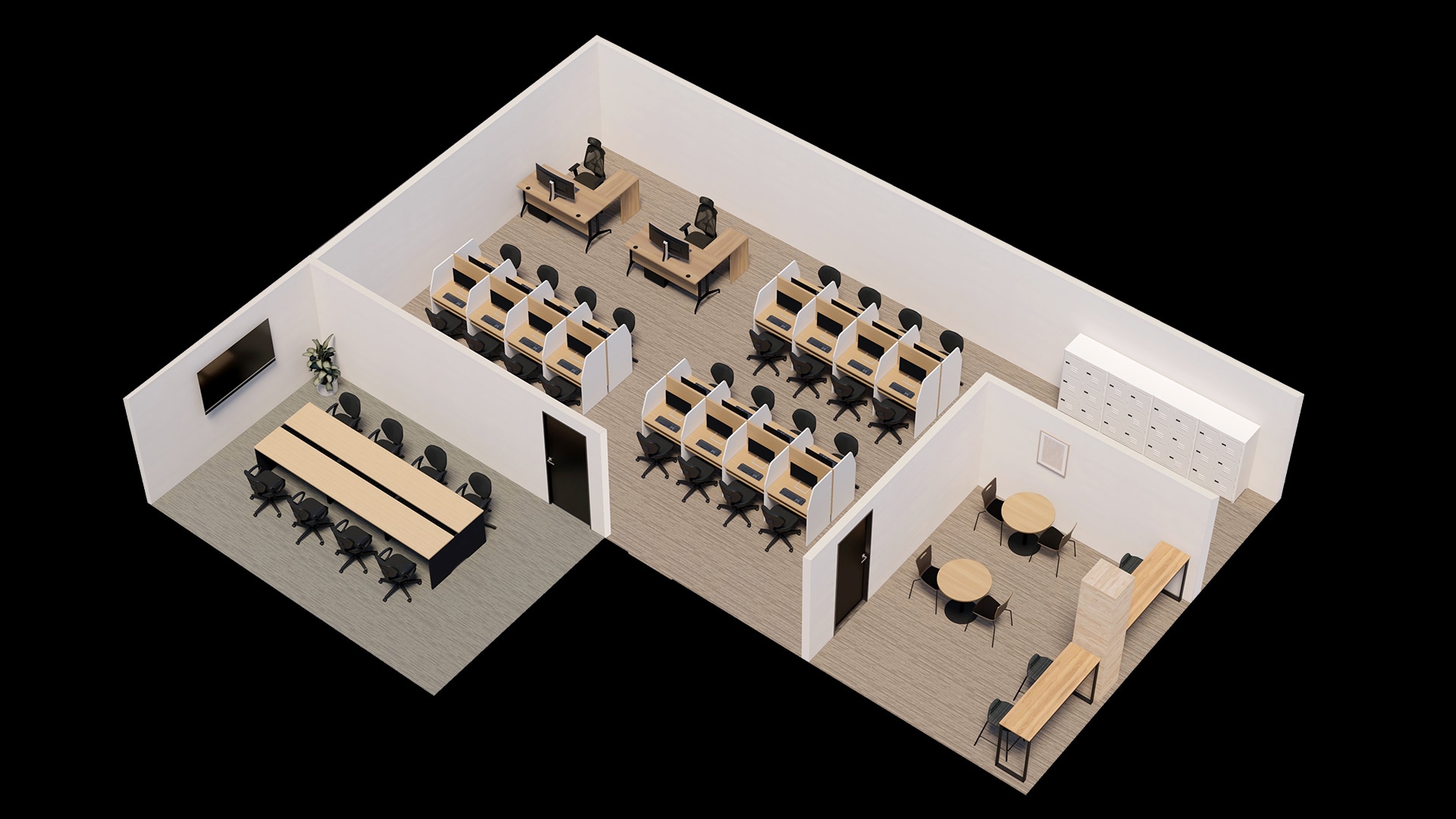 今回は、パネルデスクを活用した約40坪・社員数25人用のコールセンター型オフィスレイアウトをご紹介。目線を遮るサイドパネルが座席ごとに付いていることで、集中して業務に取り組める働きやすいオフィスデザインです。また、視界に入らない位置に収納スペースが配置されているので、フロア全体が整理整頓された清潔感のある印象に。空間全体がナチュラルでシンプルな家具で統一されていることも、クリーンで安定感のある雰囲気を作り出しています。また、小規模ながらもミーティングルームとリフレッシュルームを備え、メリハリをつけて働ける環境づくりを実現。さらに、上長席が執務エリアのすぐそばに設けられており、相談が必要な際には迅速なサポートが可能です。快適で働きやすいコールセンター型レイアウトをご検討の際にはぜひ参考にしてください。